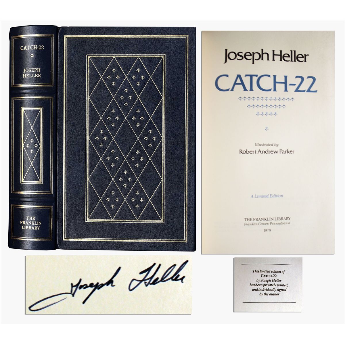 Joseph Heller signed limited edition of ''Catch-22.'' Franklin Library: Pennsylvania: 1978. The author signs clearly on the fly-leaf: ''Joseph Heller''. He explains in his introduction to this edition of his 1961 novel: ''...the title was invented...to fill a descriptive need for a kind of experience with which I wished to deal in my fiction...'' The 551pp. volume, measuring 6'' x 9.5'' and bound in blue leather with gilt lettering and edges, is in fine condition.