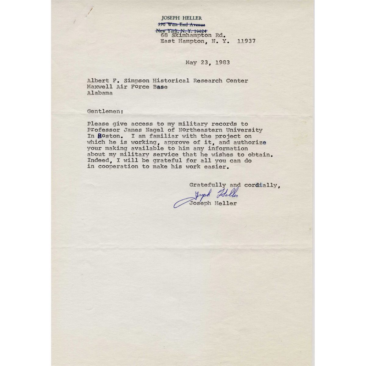 Joseph Heller typed letter signed, authorizing the U.S. Air Force to release his military records to James Nagel for Nagel's book, ''Critical Essays on Joseph Heller.'' Single page letter dated 23 May 1983 reads, ''Please give access to my military records…I am familiar with the project on which he is working, approve of it, and authorize your making available to him any information about my military service that he wishes to obtain…'' signed, ''Joseph Heller''. On 7.25'' x 10.25'' personal stationery, with envelope. Near fine.