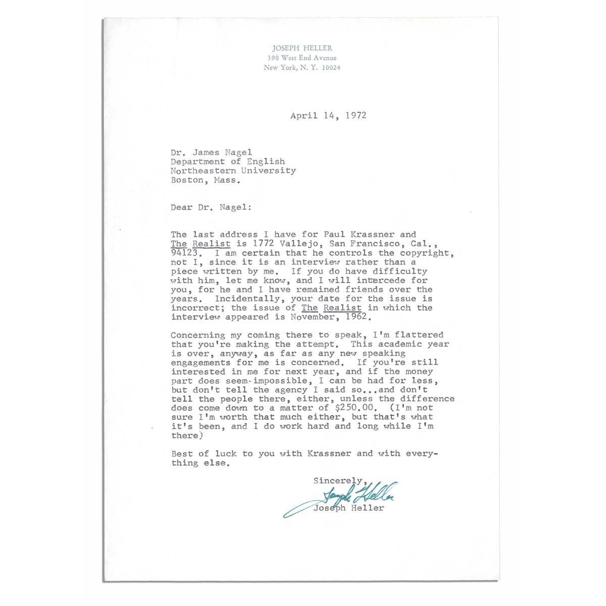 Joseph Heller typed letter signed, addressed to Professor James Nagel of Northeastern University on 14 April 1972. In part, ''…Concerning my coming there to speak, I'm flattered…if the money part does seem impossible, I can be had for less, but don't tell the agency I said so…and don't tell the people there, either…(I'm not sure I'm worth that much either, but…I do work hard and long while I'm there)…'' Signed in green ink ''Joseph Heller'' on his personal letterhead measuring 7.25'' x 10.25''. With original envelope, both near fine.