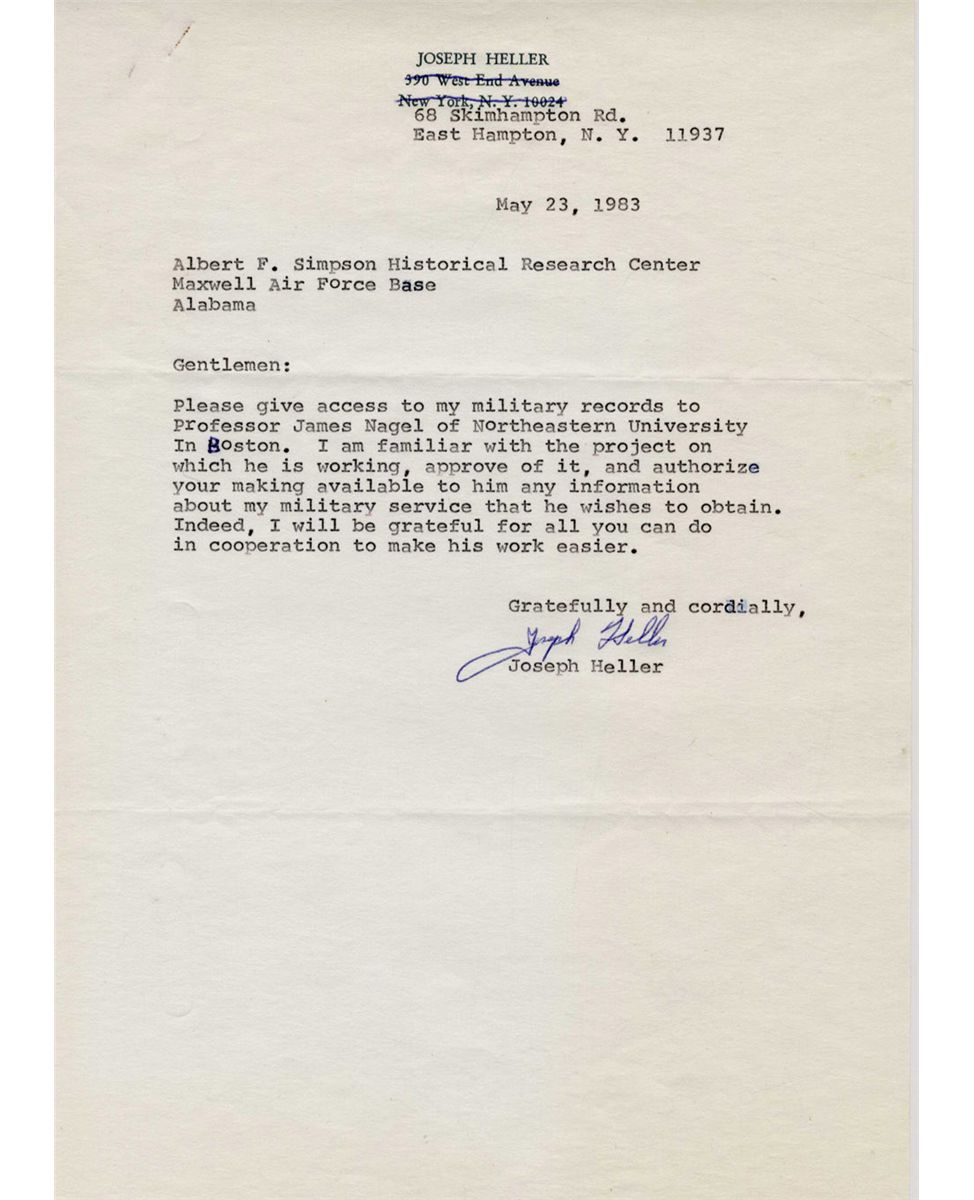 Joseph Heller typed letter signed, authorizing the U.S. Air Force to release his military records to James Nagel for Nagel's book, ''Critical Essays on Joseph Heller.'' Single page letter dated 23 May 1983 reads, ''Please give access to my military records...I am familiar with the project on which he is working, approve of it, and authorize your making available to him any information about my military service that he wishes to obtain...'' signed, ''Joseph Heller''. On 7.25'' x 10.25'' personal stationery, with envelope. Near fine.