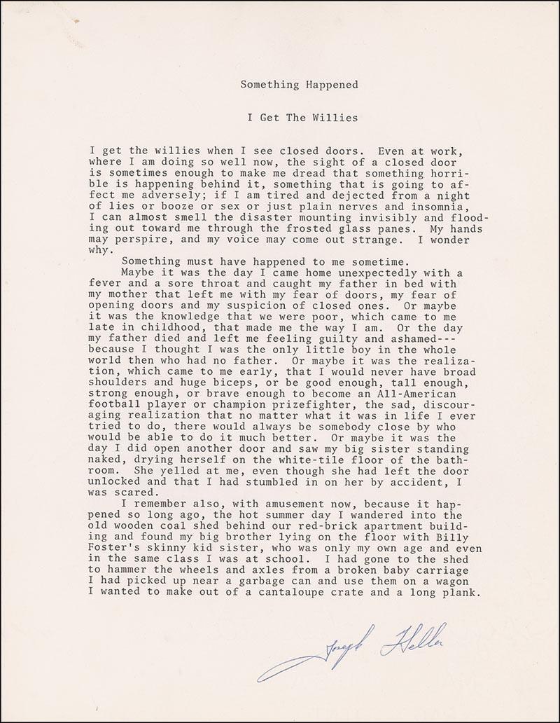 Souvenir typescript, one page, 8.5 x 11, from the opening of his second novel, Something Happened, signed at the conclusion in blue ballpoint, “Joseph Heller.” In fine condition with a few spots of soiling at the top left of the page.