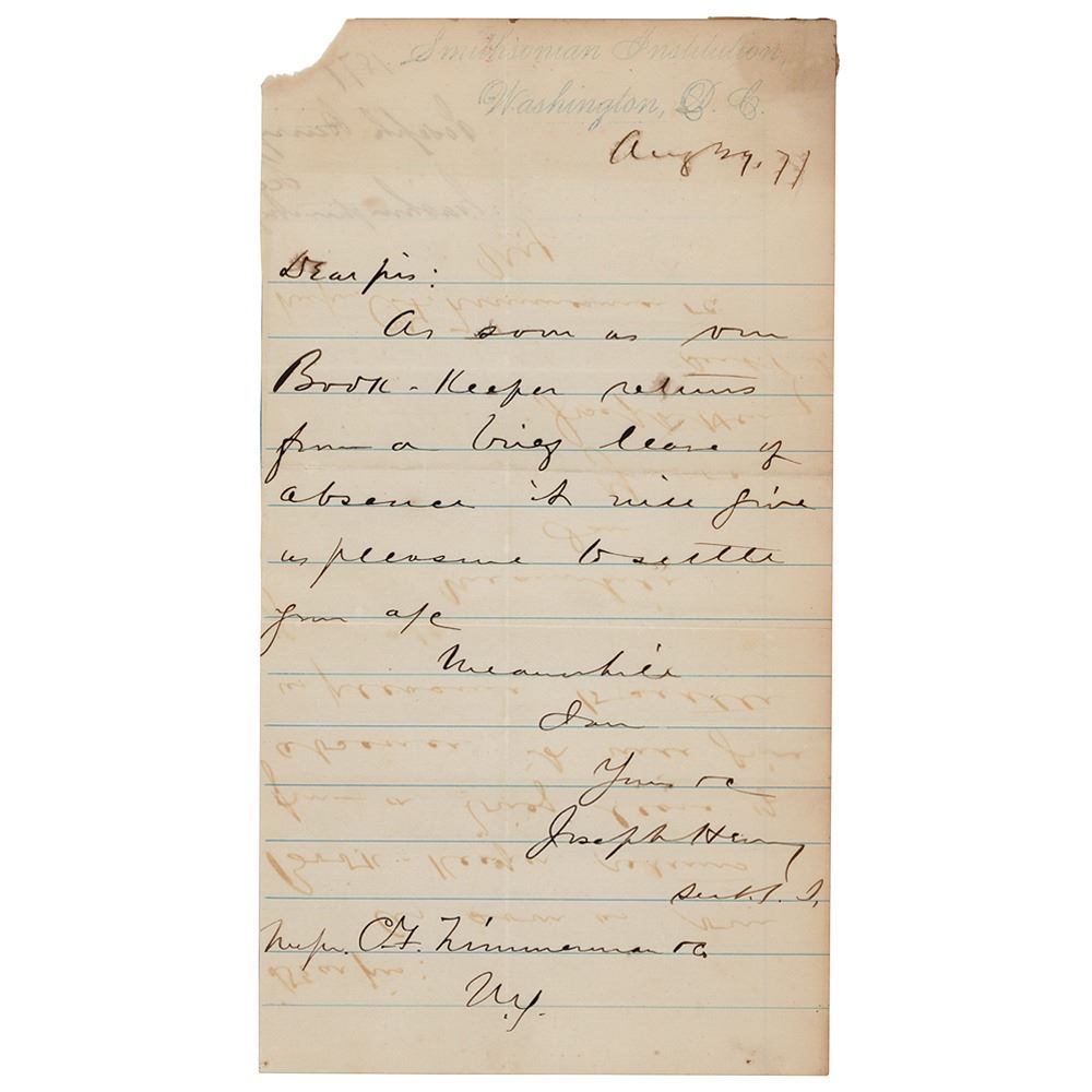 Physicist (1797–1878) who conducted experiments in the field of electromagnetism and served as the first secretary of the Smithsonian Institute. ALS signed “Joseph Henry, Sect. S. I.,” one page, 5 x 9.25, Smithsonian Institution letterhead, August 29, 1871. Handwritten letter to Messrs. C. F. Zimmerman & Co. in New York, in full: "As soon as our Book-Keeper returns from a brief leave of absence it will give us pleasure to settle your a/c." In very good to fine condition, with trimmed edges, slight ink offsetting, and paper loss to the upper left corner.
