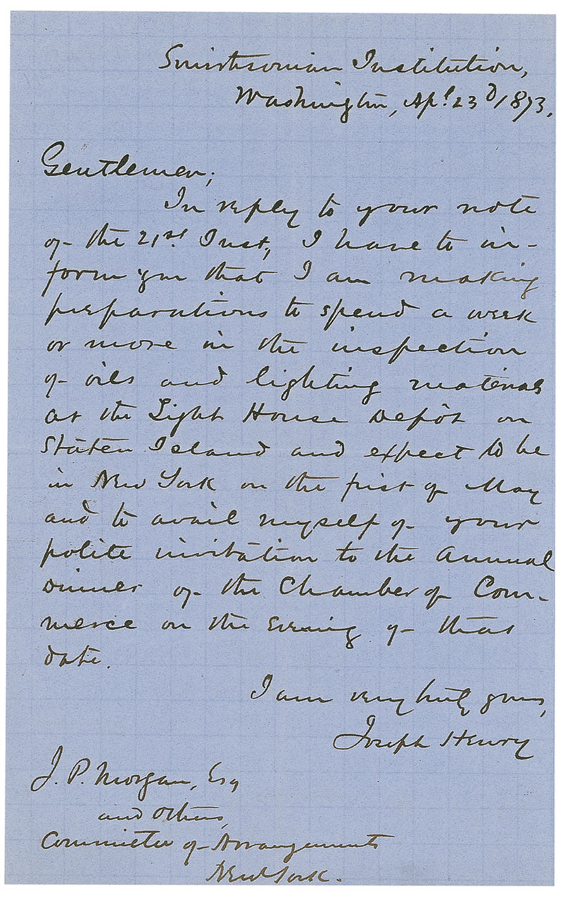 Physicist (1797–1878) who conducted experiments in the field of electromagnetism and served as the first secretary of the Smithsonian Institute. ALS, one page, lightly-lined, 5.25 x 8.25, April 23, 1873. Written from the Smithsonian Institute, to “J. P. Morgan and others Committee of Arrangements.” In part: “I am making preparations to spend a week or more in the inspection of oils and lighting material at the Light House Depot on Staten island…and to avail myself of your polite invitation of the Chamber of Commerce.” In fine condition, with central horizontal and vertical fold and a few light creases.