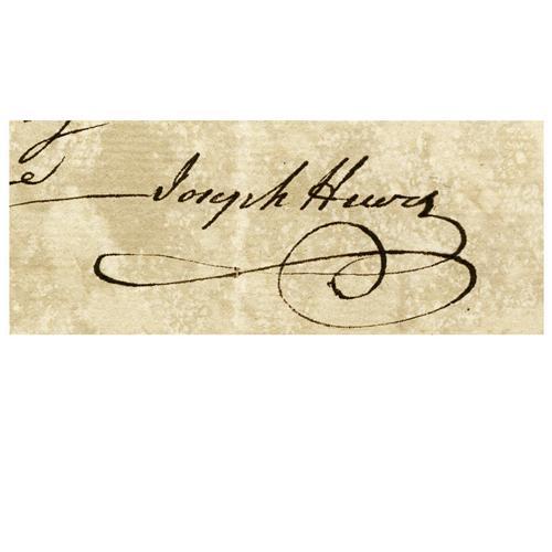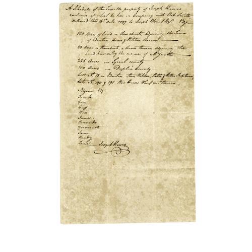 <B>Signer Joseph Hewes accounts for his slaves and other property.</B></I> <BR><BR><B>Joseph Hewes (1730 - 1779) Signer of the Declaration of Independence and the first Secretary of the Navy, fine content manuscript Document Signed</B></I> "<I>Joseph Hewes</B></I>" one page, 8" x 13", no place given, October 16, 1777 being "<I>A Schedule of the Taxable property of Joseph Hewes exclusive of what he has in Company with Rob. Smith delivered the 16th Octo. 1777 to Joseph Blount Esqr...</B></I>" The account lists all his land holdings including "<I>120 Acres of Land or there abouts, adjoining the Town of Edenton...</B></I>" which also contained a "<I>House & Kitchen</B></I>" together with 50 acres and a house "<I>...adjoining the land known by the name of McGraths...</B></I>". In addition he held 225 acres of land in Tyrrel County and 100 acres in Dauphin County as well as urban property in Edenton including "<I>...Stores, Kitchen, Stable & Hatters ship... Ware House Wharf etc...</B></I>" The tax schedule also includes the names of Hewes' ten slaves including "<I>Frank, Gun, Cuff, Will, James, Tounside, Yarmsuth, Sam, Hardy [and] Tene</B></I>" Hewes adds his name just below the names of his slaves. Hewes, born in Connecticut to Quaker parents, studied at Princeton and became a very successful merchant. Around 1760 he moved to North Carolina where he established himself in politics. In the years leading up to the Revolution, Hewes was a strong advocate for American rights and an early voice for independence. His support of war caused him to break with the Society of Friends. Light uneven toning, usual folds, else Fine condition with a dark, bold signature. Another important piece of Black Americana tying a Founding Father to slavery. From the Henry E. Luhrs Collection. Accompanied by LOA from PSA/DNA.