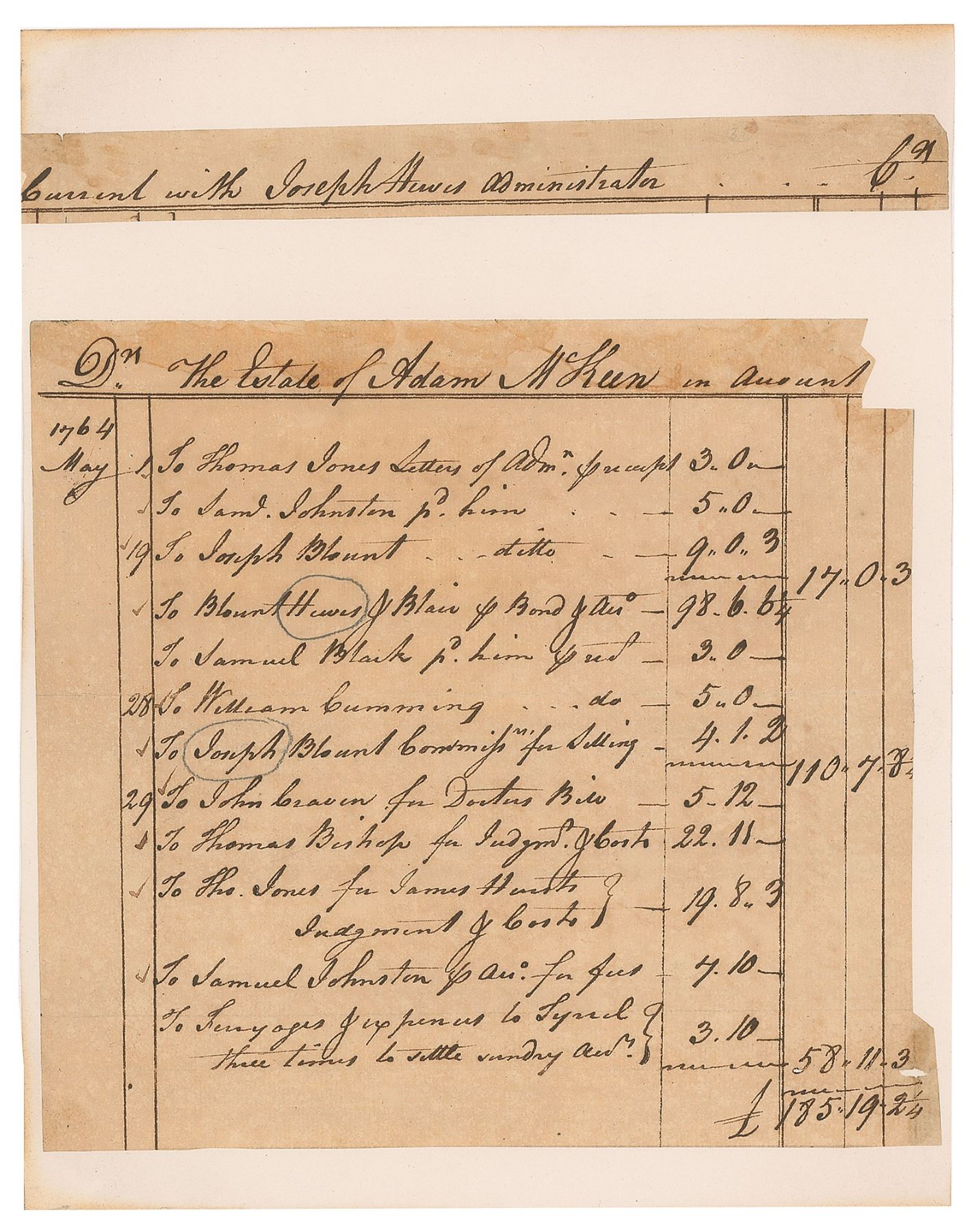 Extremely rare handwritten document by Joseph Hewes, consisting of two portions of a financial record removed from Hewes's accounting ledger and relating to "The Estate of Adam McKean." The upper section, 7.75 x .75, is signed within the text, "Current with Joseph Hewes Administrator," and the lower section, 7.5 x 7, consists of a dozen expenses accrued in May 1764, which amount to a total sum of £185.19.2 1/4. Record examples include: "To Thomas Jones Letters of Adm'r," "To Sam'l Johnston p'd him," "To Joseph Blount…ditto," "To Blount Hewes & Blair & Bond," "To Samuel Black p'd him," "To William Cumming," "To Joseph Blount Commiss'r for Selling," "To John Craven for Doctors Bill," "To Thomas Bishop for Judgm't," "To Tho. Jones for James Hunt," and "To Samuel Johnston." Both sheets are affixed to a paperstock 8 x 10 mount. In fine condition.
