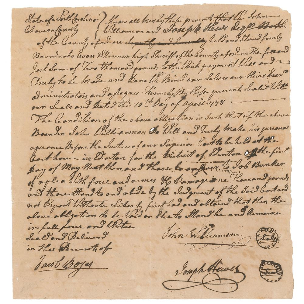 Rare Revolutionary war-dated manuscript DS, one page, 8.25 x 8.75, April 10, 1778. Legal document concerning a bail payment, in part: "Know all men by these presents that We John Williamson and Joseph Hews Esqr.…stand firmly Bound unto Evan Skinner high Sheriff…in the full and just sum of Two thousand pounds…The Condition of the above obligation is in such that if the above…John Williamson…make his personal appearance Before the Justices of our Superior Court." In fine condition. Accompanied by a full letter of authenticity from JSA.