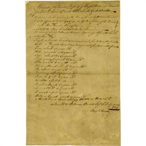 <B>Joseph Hewes Exceedingly Rare Autograph Document Signed</B></I> "<I>Joseph Hewes</B></I>" three times. One page, 9" x 13.75". Edenton, North Carolina , July 3, 1779. Headed: "<I>A Schedule of the Taxable Property of Joseph Hewes exclusive/ of what he has in Co. with Robt Smith & Nathl. Allen.</B></I>" In full, "<I>120 Acres of Land adjoining The Town, House & Kitchen thereon/ 2 Lots opposite to No. 190 & 191 in the New plan of the Town with Ware Houses Wharf &c./ 1 Lott No. 13 - Stores Kitchen Stable &c. thereon/ 50 acres of Land & House thereon adjoining McGraths Land./ </B></I><B><I>Negroes</B></I></B></I> <I>Viz,/ </B></I><B><I>Frank,</B></I></B></I> <I>a Cripple has not done a days work for 12 months past/ </B></I><B><I>Cuff,</B></I></B></I> <I>a Cripple has not done a days work for 12 months past/ </B></I><B><I>Gun</B></I></B></I> <I>about 45 years old/ </B></I><B><I>Will</B></I></B></I> <I>upwards of 50 years old/ </B></I><B><I>Sam</B></I></B></I> <I>about 35 years old/ </B></I><B><I>Tancy</B></I></B></I> <I>a wench about 25 years old/ </B></I><B><I>Peter</B></I></B></I> <I>a child 6 months old/ </B></I><B><I>Flora</B></I></B></I> <I>a wench about 40 years old/ </B></I><B><I>Peg</B></I></B></I> <I>a Girl 12 years old/ </B></I><B><I>Mourning</B></I></B></I> <I>a Girl 7 years old/ </B></I><B><I>Joan</B></I></B></I> <I>a Girl 4 years old/ </B></I><B><I>Mirtilla</B></I></B></I> <I>a Girl 3 years old / </B></I><B><I>Rachel</B></I></B></I> <I>a wench 25 years old/ </B></I><B><I>Sam</B></I></B></I> <I>a Child 4 years old/ </B></I><B><I>Hannah</B></I></B></I> <I>a Girl 2 years old/ </B></I><B><I>Betty</B></I></B></I> <I>a wench about 40 years old/ a Plantation in Tynel containing 225 acres no House on it/ delivered to William Bennett Esqr.</B></I>" On verso, Hewes has penned, "<I>Joseph Hewes's/ Taxable property 1779.</B></I>" A few days before his wedding, Joseph Hewes' fiancée died suddenly. He remained a bachelor for the rest of his life. At the start of the American Revolution, Hewes, a successful ship owner and merchant, put his entire fleet at the disposal of the Continental Navy. As Secretary of the Naval Affairs committee of the Continental Congress, he was, in effect, America's first Secretary of the Navy. A member of the Continental Congress (1774-1776) and a signer of the Declaration of Independence, Hewes accepted reelection to Congress in 1779 despite health problems. Just four months before his death in Philadelphia at age 49, Hewes handwrote and signed this schedule of his estate. Lightly stained, the entire document has been expertly strengthened with crepeline for preservation and is in fine condition. According to Charles Hamilton in <I>Collecting Autographs and Manuscripts,</B></I> "Hewes' autograph is of great scarcity. Of the fifty-six immortals who signed the Declaration of Independence, only a few are harder to obtain." This remarkable document bears three signatures of Joseph Hewes!<BR><BR><b>Shipping:</b> Flat Material, Small (<a target="_blank" href="http://www.heritageauctions.com/common/shipping.php">view shipping information</a>)