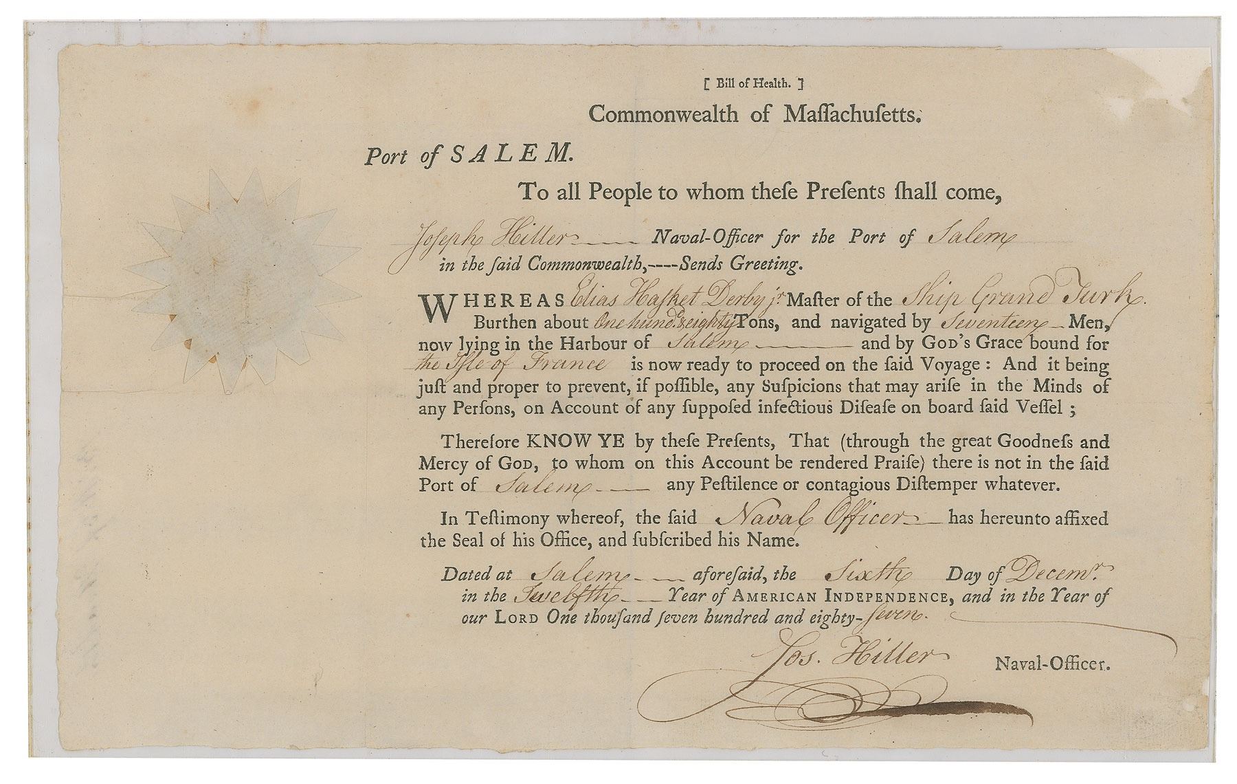 Veteran of the American Revolution, who in 1789 was appointed by George Washington as the second collector at the port of Salem. Partly-printed DS, signed “Jos. Hiller,” one page, 12.5 x 7.5, December 6, 1807. Official document issued at the port of Salem, Massachusetts, by Hiller, in part: "Whereas Elias Hasket Derby, Jr., Master of the Ship Grand Turk…now lying in the Harbour of Salem and by God's Grace bound for the Isle of France is now ready to proceed on the said Voyage: And it being just and proper to prevent, if possible, any Suspicions that may arise in the Minds of any Persons, on Account of any supposed infectious Disease on board said Vessel; Therefore Know Ye by these Presents, That…there is not in the said Port of Salem any Pestilence or contagious Distemper whatever." Signed at the conclusion by Hiller as a naval officer. The white paper seal affixed to the upper left remains intact. In fine condition, with two professionally restored areas of corner paper loss.