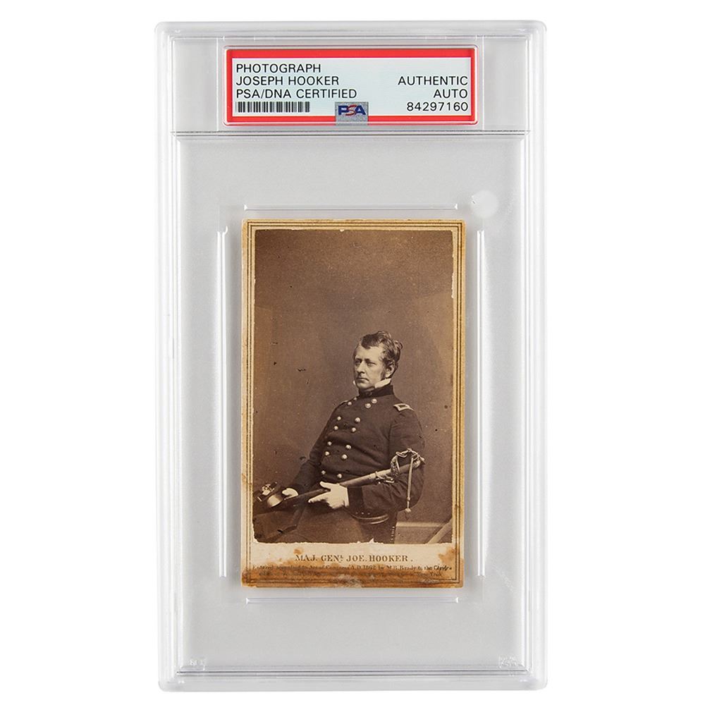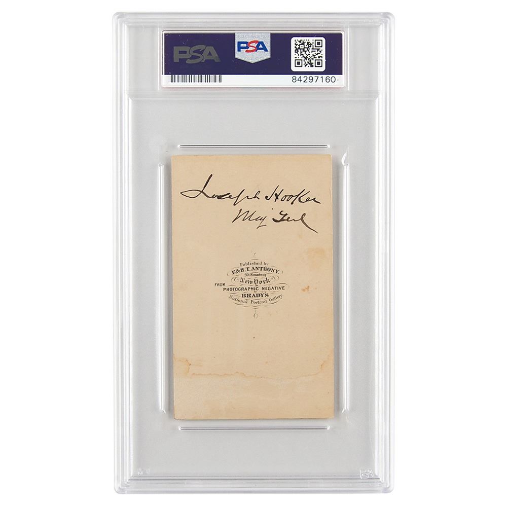 Desirable 2.25 x 4.25 carte-de-visite photo of 'Fighting Joe' in uniform with sword in hand, published by E. & H. T. Anthony from a negative from Brady's National Portrait Gallery, signed on the reverse in bold ink, "Joseph Hooker, Maj. Genl." In very good to fine condition, with heavy staining in the bottom border on the front. Encapsulated in a PSA/DNA authentication holder.