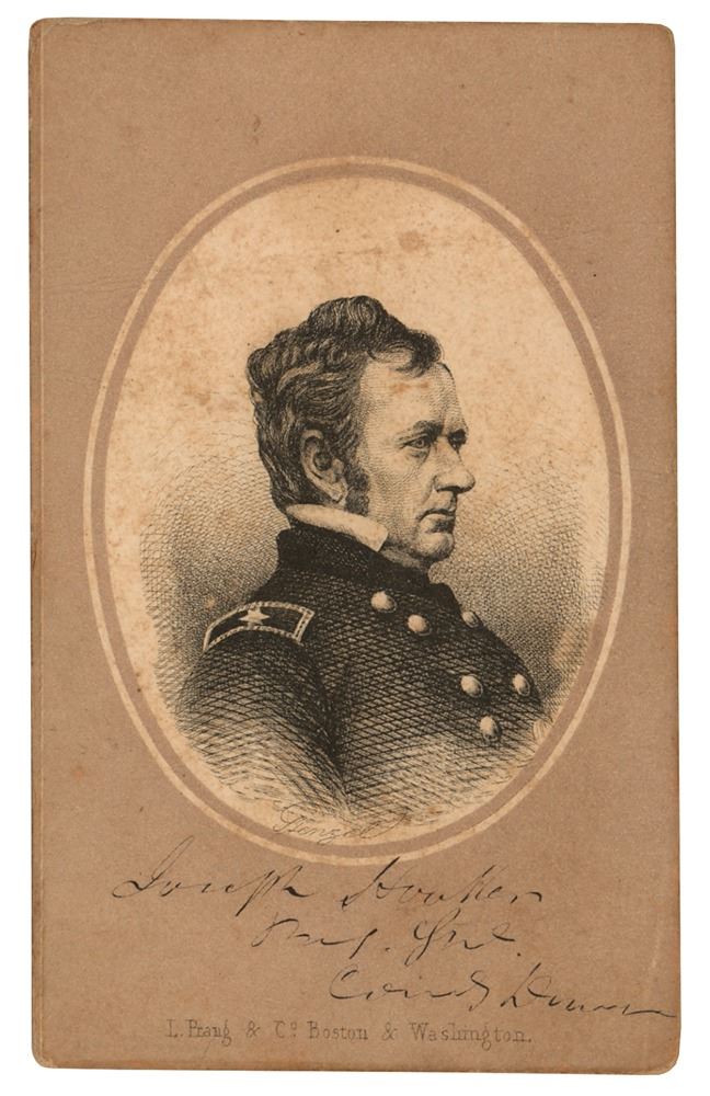 Desirable 2.5 x 4 carte-de-visite photo of an artistic profile portrait of 'Fighting Joe' in uniform, signed below in ink, "Joseph Hooker, Maj. Genl., Comdg." Published by L. Prang & Co. of Boston. In very good to fine condition, with light soiling, skipping to the signature, and two unobtrusive diagonal creases.