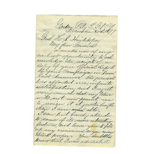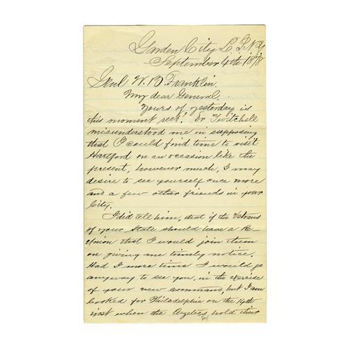 <B>Joseph Hooker criticizes using Federal troops to break the Strike of 1877</B></I> <BR><BR><B>Civil War General Joseph Hooker (1814-1879) Autograph Letter Signed,</B></I> "<I>J. Hooker Maj. Genl.</B></I>", nine pages, 5" x 8", Garden City, New York, December 20, 1877 to his former comrade-in-arms William B. Franklin (1823-1903). Hooker writes on the massive railroad strikes that crippled the nation during the summer of 1877 and the use of federal troops to break the strike. <BR><BR>"<I>You doubtless know that I was educated for a regular, or trained soldier, and until the War of the Rebellion, I had been made to believe that the strength of a Military power lay in its trained troops, and my convictions remained unchanged until the battle of Williamsburg... opened my eyes to my error. In that fight the greater part of my troops were under fire for the first time, and many of whom, I have no doubt, had never before heard the report of the discharge of a musket, and yet they went in to a battle at the earliest dawn, at one time waged with unusual violence, and stuck to it until night came, as I had never seen troops before freeze to a fight. In previously disciplining my command at Blandensburg I had remarked with how much more ease and satisfaction they were controlled, and educated than were the class of men who were recruited to fill the ranks of our regular Army. Besides they appeared to me to be more identified with our institution than the men who composed the rank and file in the regular Army, and the feeling inspired by their conduct in the first battle continued to strengthen to the end of the Rebellion, until now as it ever will be, I trust, my conviction that the strength, and perpetuity of our Nation depends upon our Militia, over any other power in the Nation, and until all our people realize this fact as I do, I fear our Militia forces will not receive the consideration from our Officials they so justly deserve. It is true strong influences were operating to the feeling of all our loyal people in the last war, as home, Country everything held dear, were involved in the issue which was not the case in the Strikers War last Summer, but under discreet intelligent Officers, I contend that the Militia are more easily influenced, and governed than corresponding numbers in an Army of trained bands... My only regret that Gov. Hartfrant was not at home in the incipient movements of the disturbers of the peace in your State, as then his prompt action would doubtless have prevented, an organization of the Mob which threatened to disturb, not only our business, but almost the existence of the Government itself... I do not now believe that it will be unwise in us to anticipate a more frequent recurrence of storms in our political World than we have yet experienced... I do not believe in the policy inaugurated by Genl. Grant in employing Soldier, and Bayonets to control, and take part in the affairs of States, and I believe it will be highly improper, and impolitic to employ the Army in any such work... We require a small standing Army to hold our Forts, and frontiers that it is all... the facilities the Rail Roads furnish us for massing troops, it is a question to my mind whether it is not better or a nation to rely on muscle, more than masonry for its defense. The latter can easily be destroyed, the former never...</B></I>" <BR><BR>A truly fine letter in which a former subordinate criticizes policies of his ex-commander in favor of the supremacy of states' rights. Reconstruction had come to an end in 1877 when the last federal troops left the former Confederate States. The experience left many, both in North and South, angry and bitter. The growing conflict between capital and labor in the rapidly industrializing nation would again test the limits of federal authority. <I>Together with</B></I> a second <B>Joseph Hooker Autograph Letter Signed,</B></I> <I>J. Hooker Maj. Genl.</B></I>", two pages, 5" x 8", Garden City, New York, September 4, 1878, again to General William B. Franklin, discussing a reunion. Very light creases, else very fine. Two fine letters between former comrades. From the Henry E. Luhrs Collection. Accompanied by LOA from PSA/DNA.