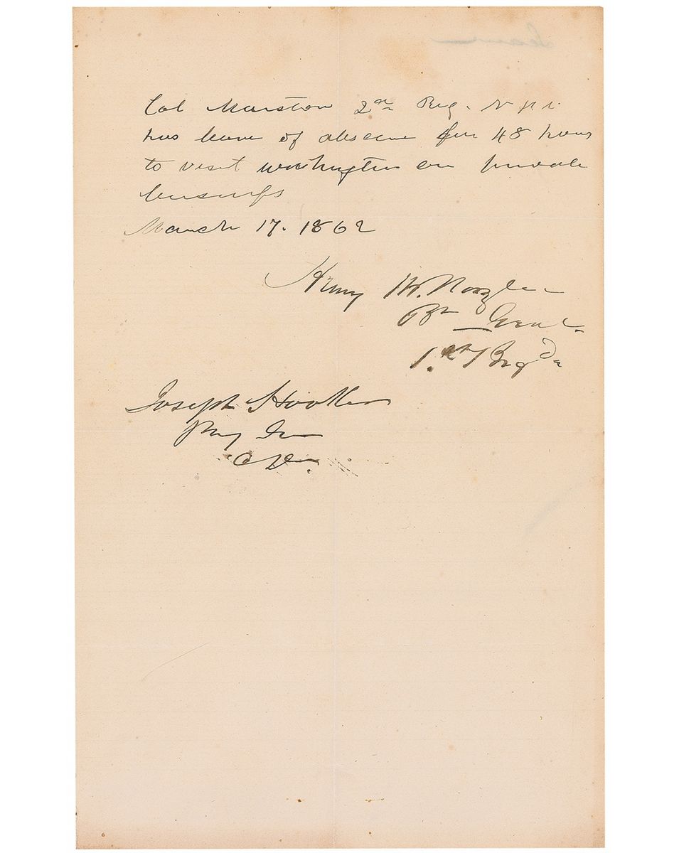 Notorious and immensely unpopular Union general (1814–1879), Hooker was criticized for his erratic leadership, heavy drinking, poor sense of diplomacy, and the freewheeling atmosphere of his headquarters. War-dated endorsement, “Joseph Hooker, Maj Gen,” at the bottom of a pass issued to Colonel Marston, one page 5 x 8, dated March 17, 1862. Pass reads, in part: “Col. Marston…has leave of absence for 48 hours to visit Washington on private business.” Also endorsed by General Henry Naglee. Intersecting folds, one through a single letter of signature, and scattered light toning, otherwise fine condition.