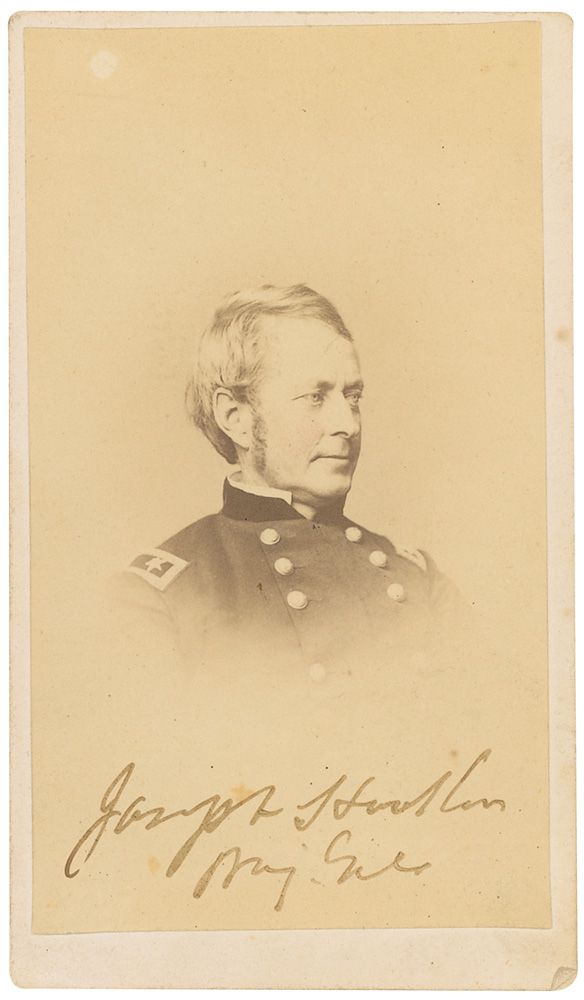 Notorious and immensely unpopular Union general (1814–1879), Hooker was criticized for his erratic leadership, heavy drinking, poor sense of diplomacy, and the freewheeling atmosphere of his headquarters. Original 2.5 x 4.25 carte-de-visite bust portrait of Hooker in uniform, by an anonymous studio, signed in the lower border in black ink, “Joseph Hooker, Maj. Gnl.” A tiny spot of surface loss to the upper left, subtle foxing to the lower portion of the image, and trivial corner tip dings to the bottom corners, otherwise fine condition.