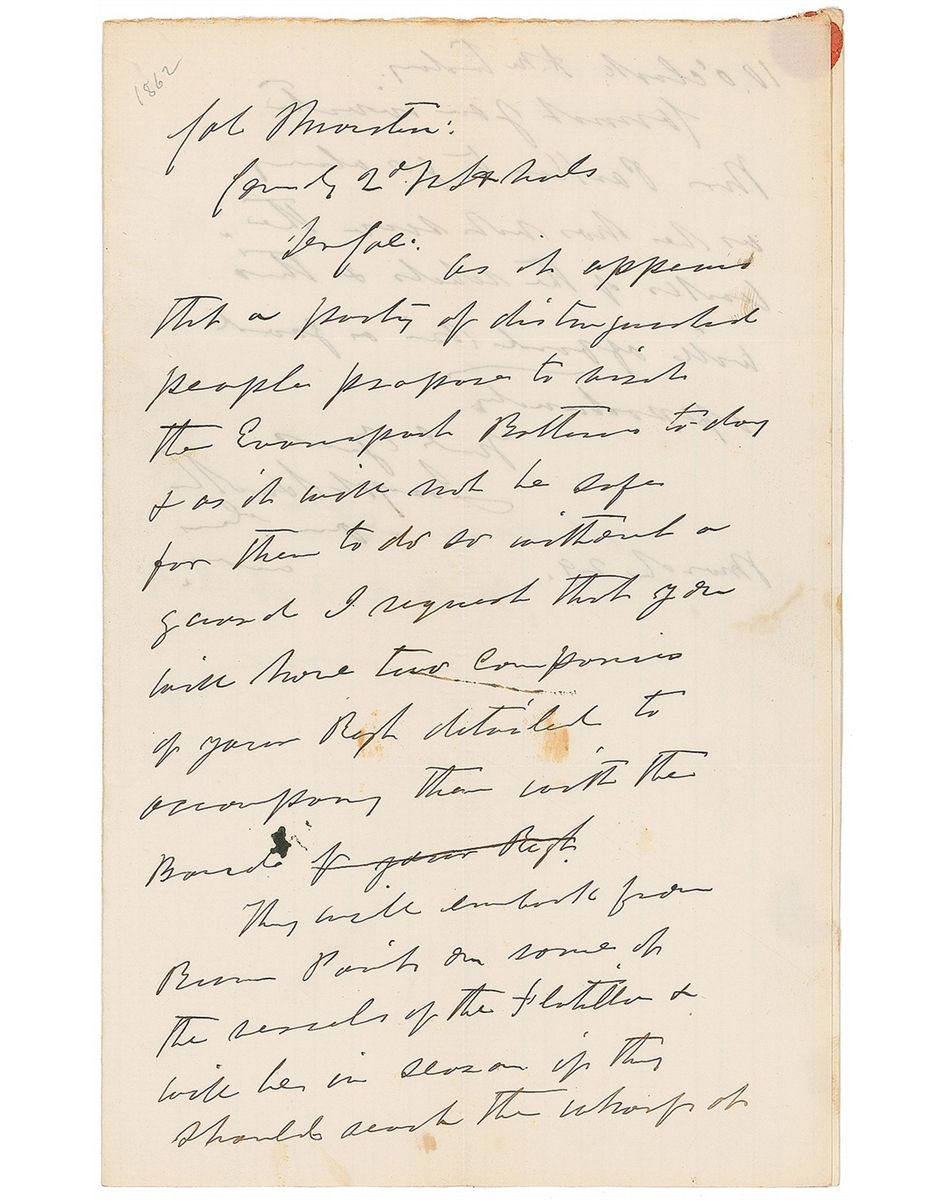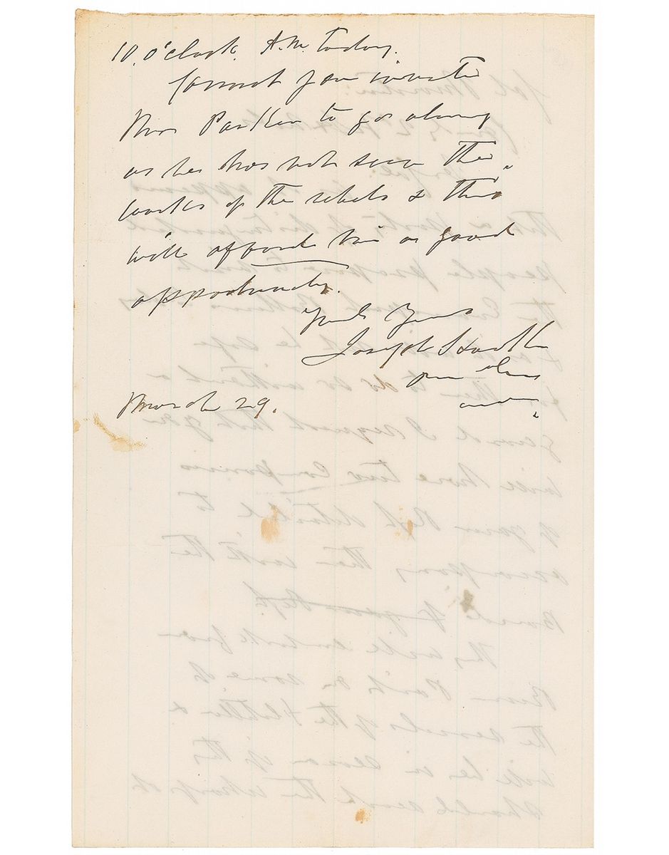 Notorious and aggressive Union general (1814–1879) who distinguished himself at the Battle of Williamsburg in 1862 and as a result was promoted to major general; later that year he led troops into battle at the Second Battle of Bull Run and Antietam. Scarce Civil War–dated ALS, one page both sides, 5 x 7.75, circa March 1862. Letter to a a fellow soldier. In part: “As it appears that a party of distinguished people propose to visit the Encampment Batteries today & as it will not be safe for them to do so without a guard I request that you will have two companies of your Regt detailed to accompany them.” Reverse of the second integral page bears a docketing notation with a date of March 1862. Intersecting folds and a few small areas of staining, otherwise fine condition. Just the fourth Hooker ALS we have ever offered, and the first in nearly a decade.