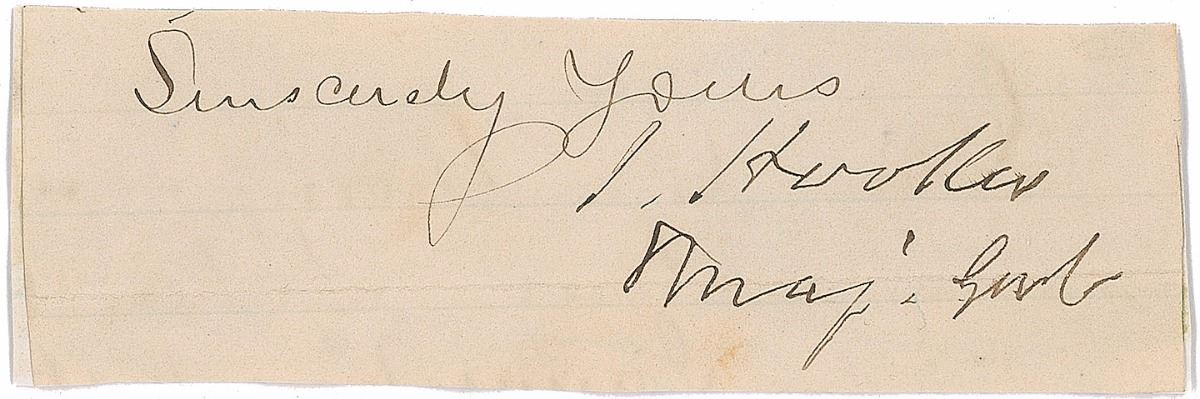 Ink signature, “J. Hooker, Maj. Genl.,” on an off-white 3.75 x 1.25 slip clipped from the conclusion of a letter. Affixed to a same-size card. A horizontal fold passing through his rank, scattered creases and wrinkles, and some rippling to edges, otherwise fine condition. Accompanied by a small modern glossy photo.
