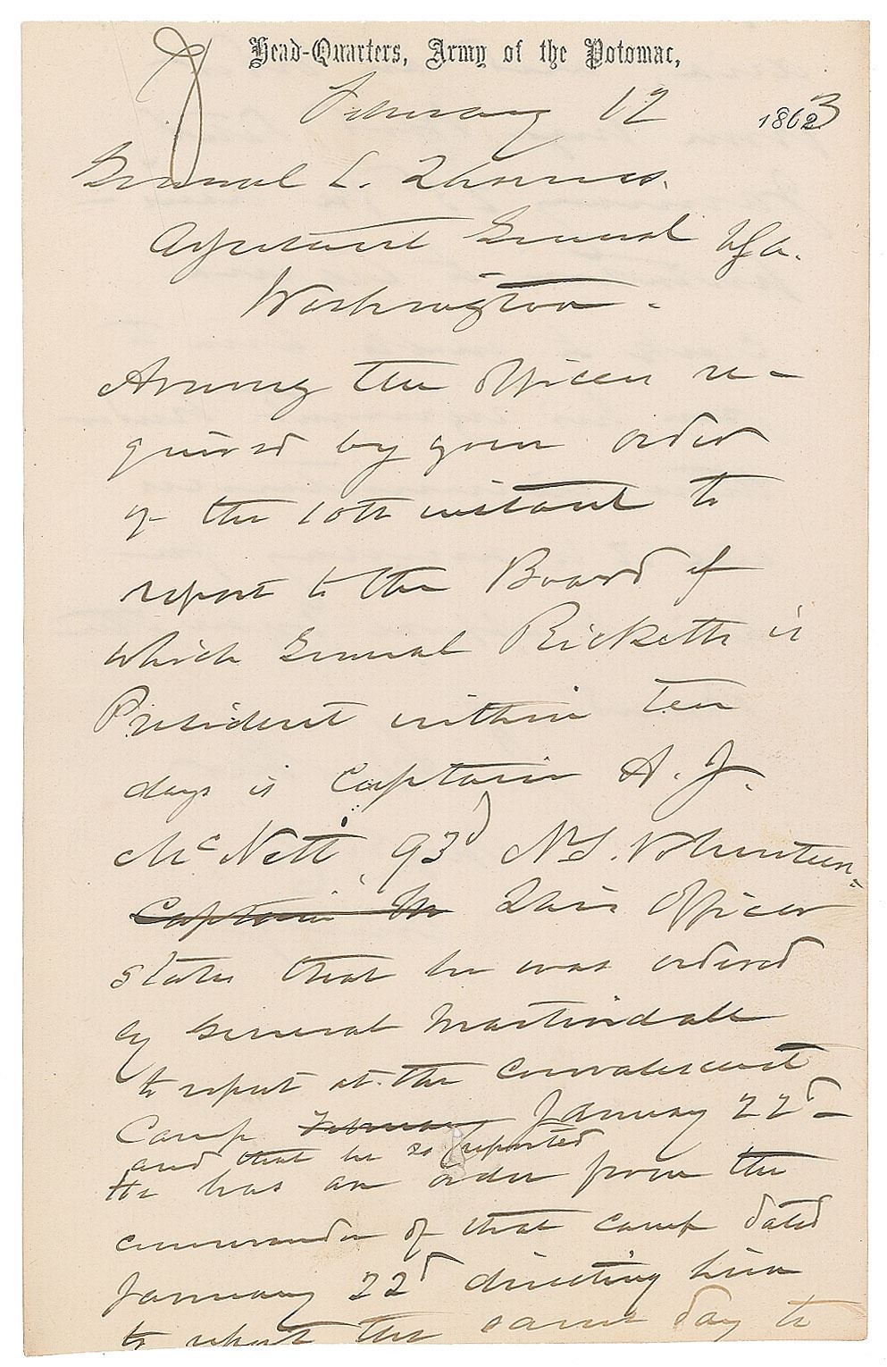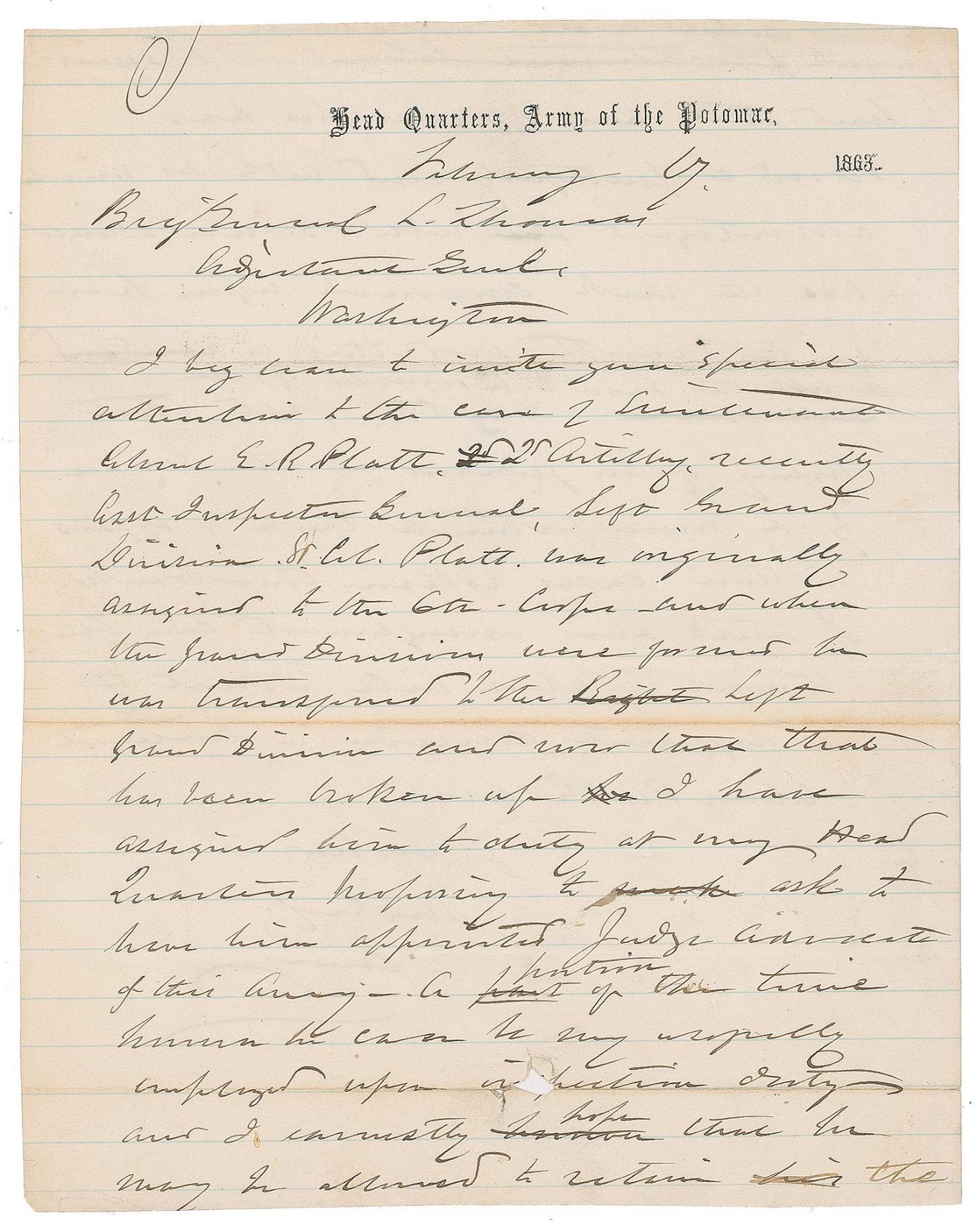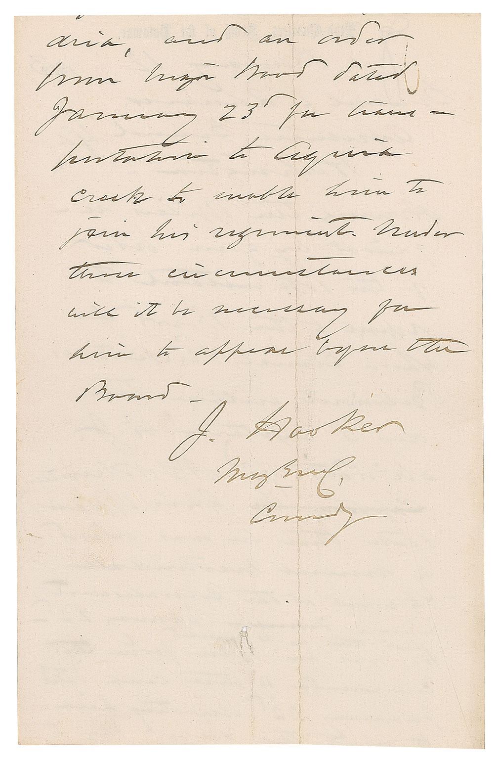 Two Civil War–dated ALSs, signed "J. Hooker, Maj. Genl., Comdg.," each one page both sides, Headquarters, Army of the Potomac letterhead, February 1863, both to Adjutant General Lorenzo Thomas. The first is dated February 12, 1863, 4.75 x 7.5, in part: "Among the officers required by your order of the 10th instant to report to the Board of which General Ricketts is President within ten days is Captain A. J. McNett 93d NY Volunteers. This officer states that he was ordered by General Martindale to report…January 22d…Under these circumstances will it be necessary for him to appear before the Board." The second is dated February 17, 1863, 7.5 x 9.5, in part: "I beg to invite your special attention to the case of Lieutenant Colonel E. R. Platt, 2d Artillery…Lt. Col. Platt was originally assigned to the 6th Corps, and when the Grand Division were formed he was transferred to the Left Grand Division…I have assigned him to duty at my Head Quarters proposing to ask to have him appointed Judge Advocate of this Army…I earnestly hope that he may be allowed to retain the rank he held as Asst. Inspector General. It seems hard that an officer who has served faithfully and with so much advantage to public service should lose the rank conferred upon him for his worth." In overall very good to fine condition, with trimmed edges and small tears to both.