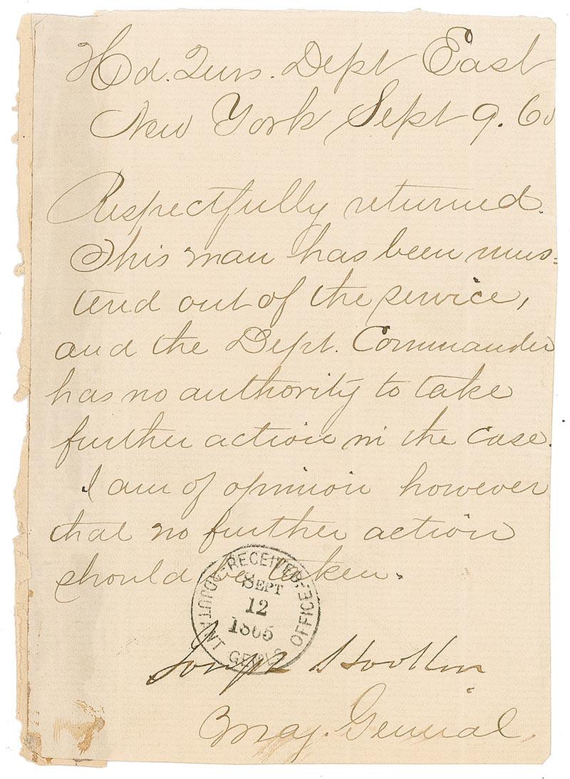Notorious and immensely unpopular Union general (1814–1879), Hooker was criticized for his erratic leadership, heavy drinking, poor sense of diplomacy, and the freewheeling atmosphere of his headquarters. Endorsement signature, “Joseph Hooker,” at the bottom of a one-page memo, 3.75 x 5.25, no date but receiving stamp of September 12, 1865. In full: “Respectfully returned. This man has been mustered out of the service, and the Dept. commander has no authority to take further action in the case. I am of opinion, however, that no further action should be taken.” In very good condition, with a black receiving stamp touching his first name, light creasing, trimmed edges, and a mounting strip on the reverse along the left side showing through to the front. Accompanied by an unsigned etching. Nice signature from one of the more dubious names of the Civil War.