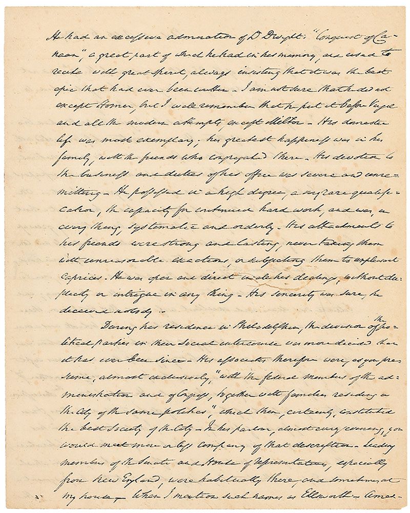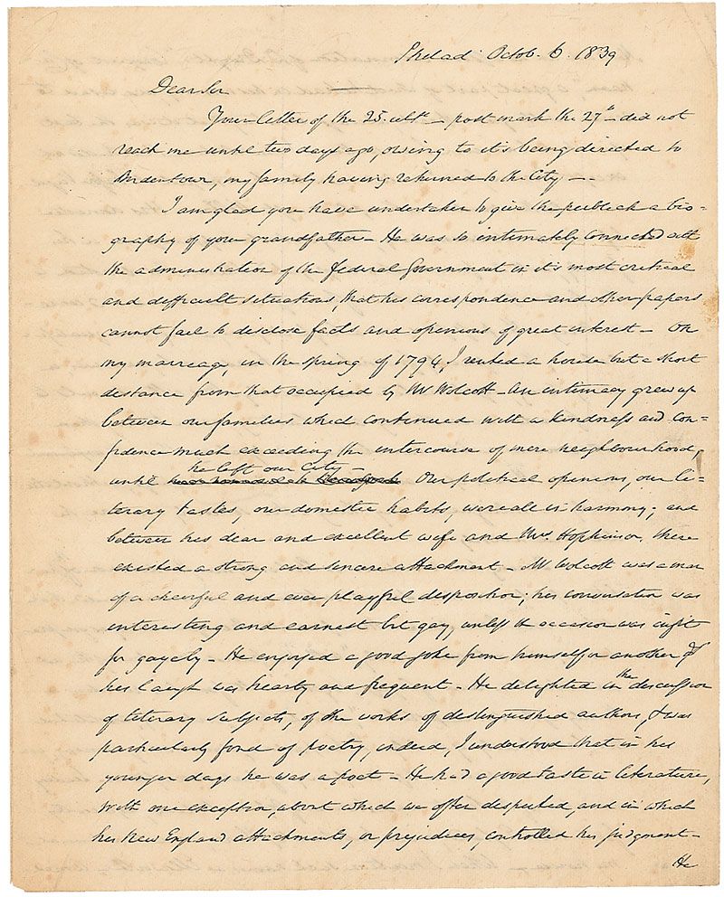 Congressman from Pennsylvania who later served as a federal judge (1770–1842). ALS signed “Jos. Hopkinson,” four pages on two adjoining sheets, 7.75 x 10, October 6, 1839. Letter to the grandson of Oliver Wolcott, Jr., former Secretary of the Treasury and Governor of Connecticut. In part: "I am glad you have undertaken to give the public a biography of your grandfather. He was so intimately connected with the administration of the federal government in its most crucial and difficult situations, that his correspondence and other papers cannot fail to disclose facts and opinions of great interest…Mr. Wolcott was a man of cheerful and ever playful disposition; his conversation was interesting and earnest…He had a good taste in literature, with one exception, about which we often disputed, and in which his New England attachments, or prejudices, controlled his judgment. He had an excessive admiration of Dr. Dwight: Conquest of Canaan, a great part of which he had in his memory, and used to recite with great spirit, always insisting that it was the best epic that had ever been written. I am not sure that he did not except Homer, but I well remember that he put it before Vergil and all the moderns attempts, except Milton." In fine condition. Hopkinson's career as a jurist was marked by prudence and his opinions characterized by clarity and literary skill—gifts certainly evident in the present letter, praising an important figure in early American history.
