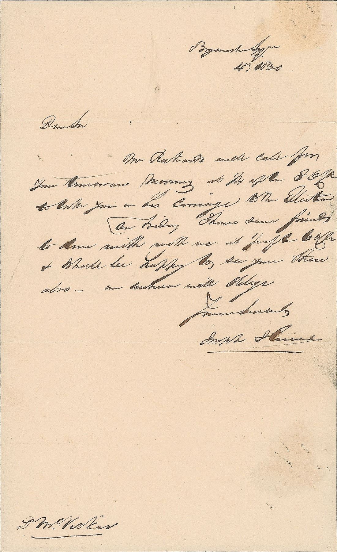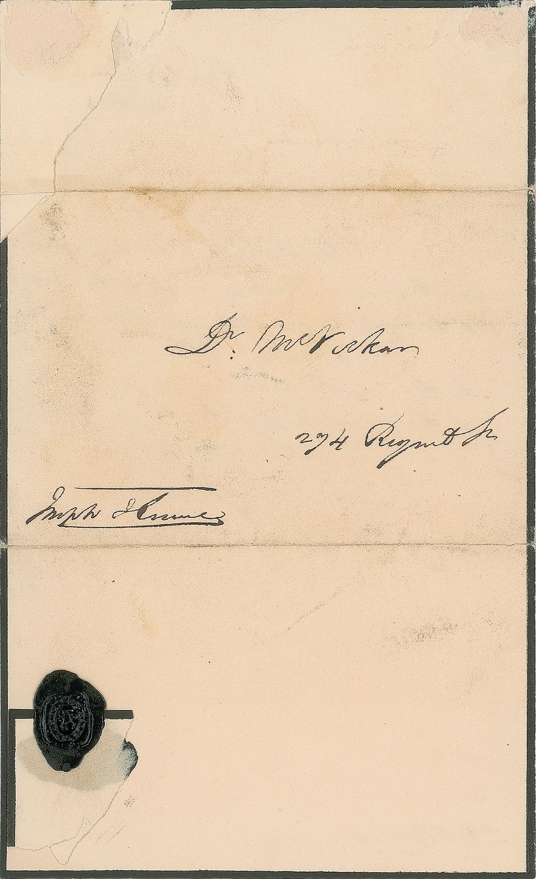Scottish doctor and radical member of Parliament (1777–1855). Twice-signed ALS, one page, 4.5 x 7.25, 1830. Letter to Dr. McVickar, in part: "Mr. Richards will call for you tomorrow morning at 1/4 after 8 o'ck to enter you in his carriage to the election. On Friday I have some friends to dine with me…& shall be happy to see you there also." Reverse of the second integral black-bordered page with original black wax seal hand-addressed by Hume, who signs his name along the bottom. In very good to fine condition, with some light stains to the letter, and paper loss to its integral address leaf.
