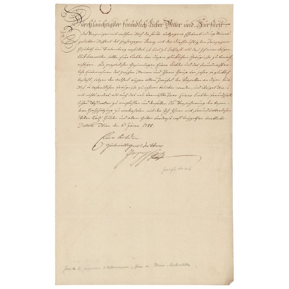 Manuscript DS in German, signed “Joseph,†one page, 8.5 x 13.75, January 6, 1788. Untranslated document signed at the conclusion by Joseph II. In fine condition.