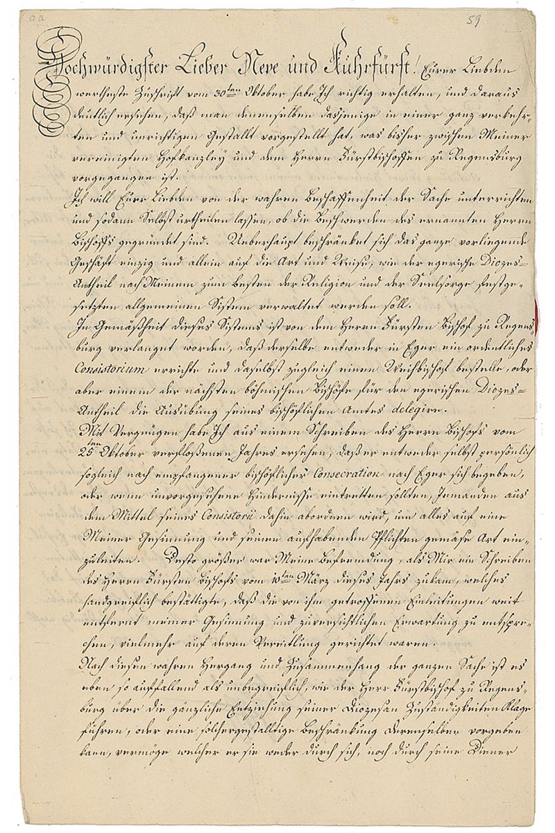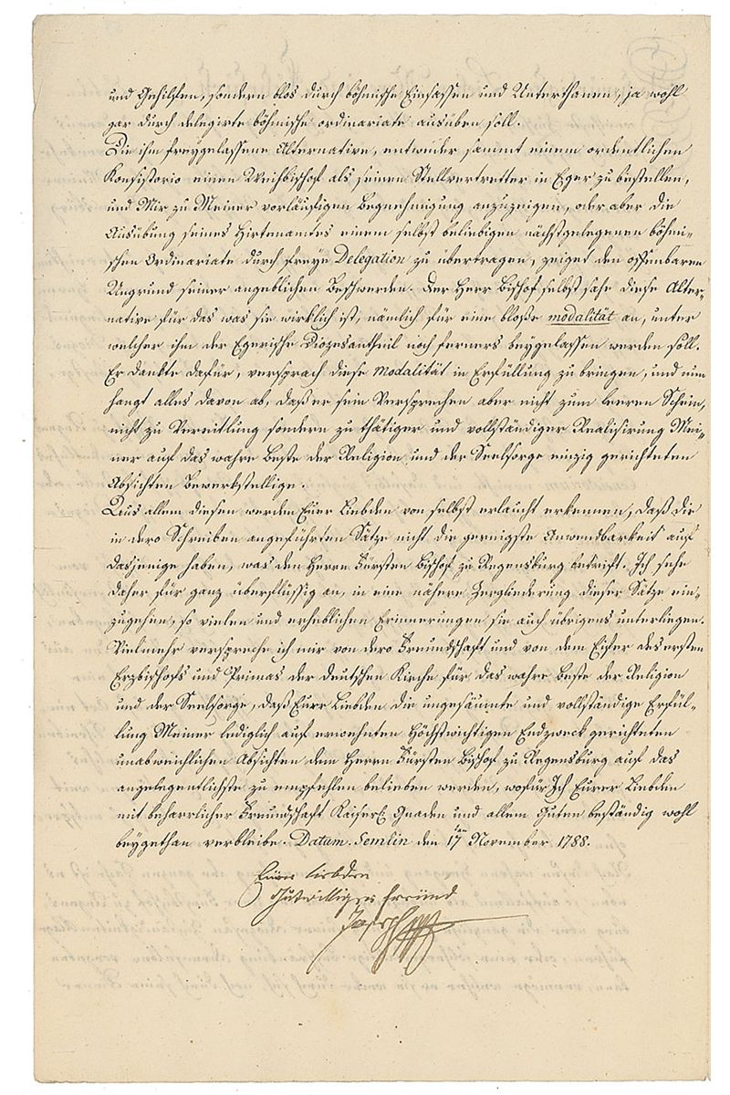 Holy Roman Emperor (1741–1790) from 1765 until his death and ruler of the Habsburg lands. LS in German, signed “Joseph,” as Holy Roman Emperor, one page both sides, 8.5 x 13.5, November 17, 1788. Untranslated letter to Erthal, the Archbishop of Mainz. Integral leaf addressed to Friedrich Karl Joseph von Erthal, Prince-Elector and Archbishop of Mainz. In fine condition, with intersecting folds, some light creases, and a few trivial spots.