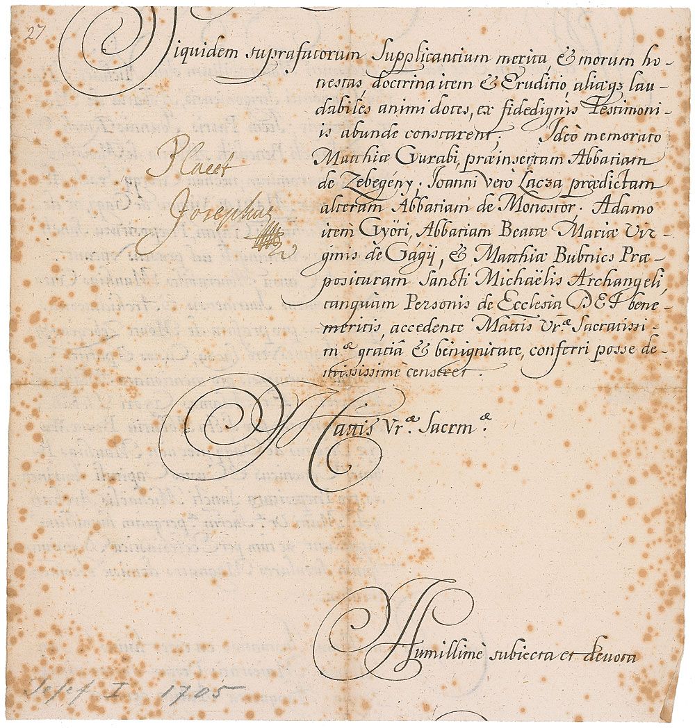Holy Roman Emperor from 1705 until his death (1678–1711). Partial manuscript DS, in Latin, one page, 8.5 x 9, no date. Untranslated partial document in Latin. In very good condition, with central vertical and horizontal folds and heavy foxing to borders.