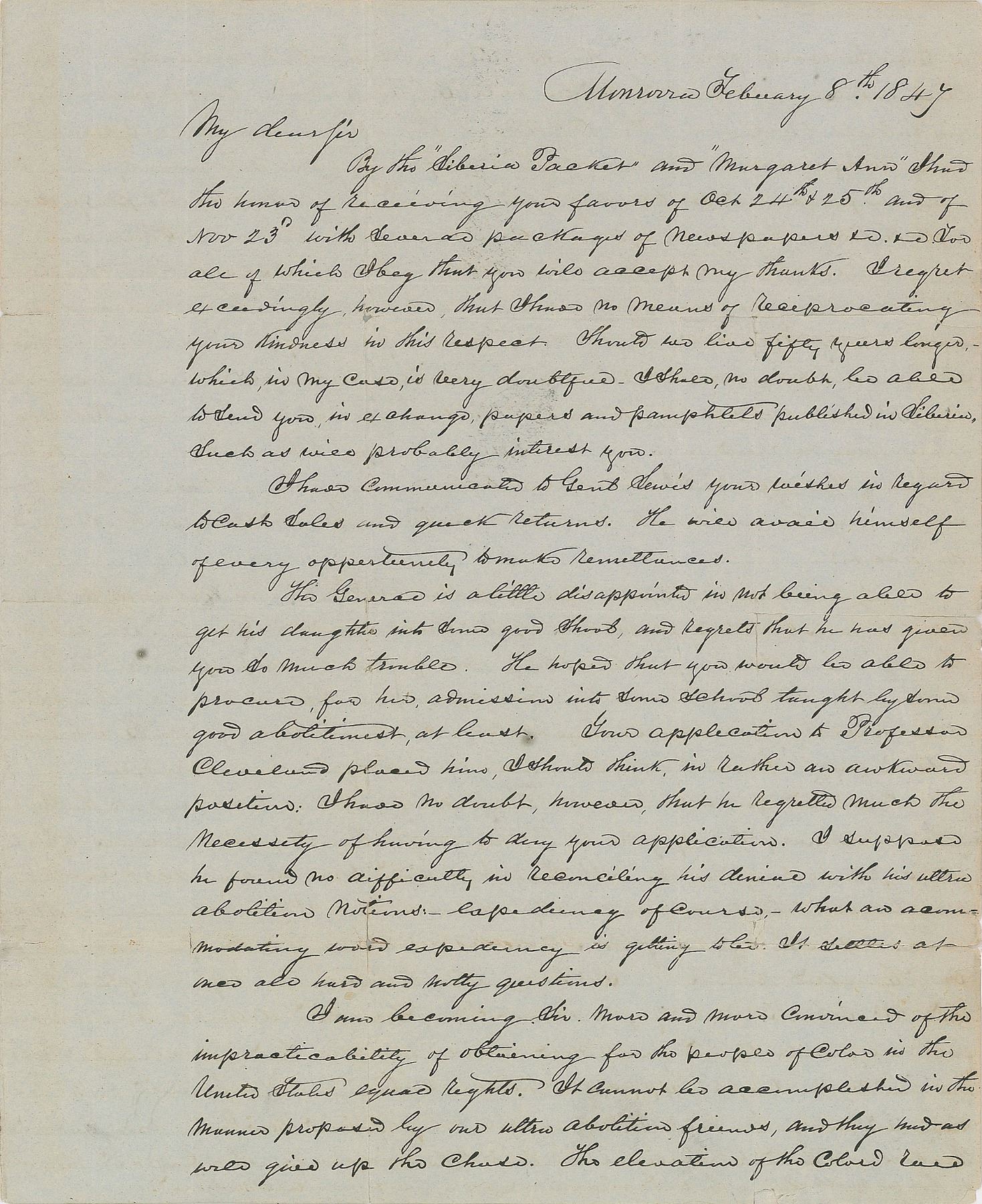 The accounts of the Ladies Liberia School Association of your city have been forwarded according to promise. There remains a balance of Fifty dollars, and some cents, in favor of the Association, which I promised to pay over to Mr. Locke as their Agent. I ascertained, however, that Mr. Locke was doing nothing in the way of teaching; and was selling everything he could put his hands on belonging to the Association without orders to that effect. I therefore declined paying it over to him. Will you please pay the amt. to Miss Morris as the Treasurer and charge the same to my acct.?” Roberts goes on to discuss further business transactions in detail. In very good condition, with a few tape repairs to split folds, small areas of paper loss at fold intersections, and seal-related paper loss to the integral address leaf.