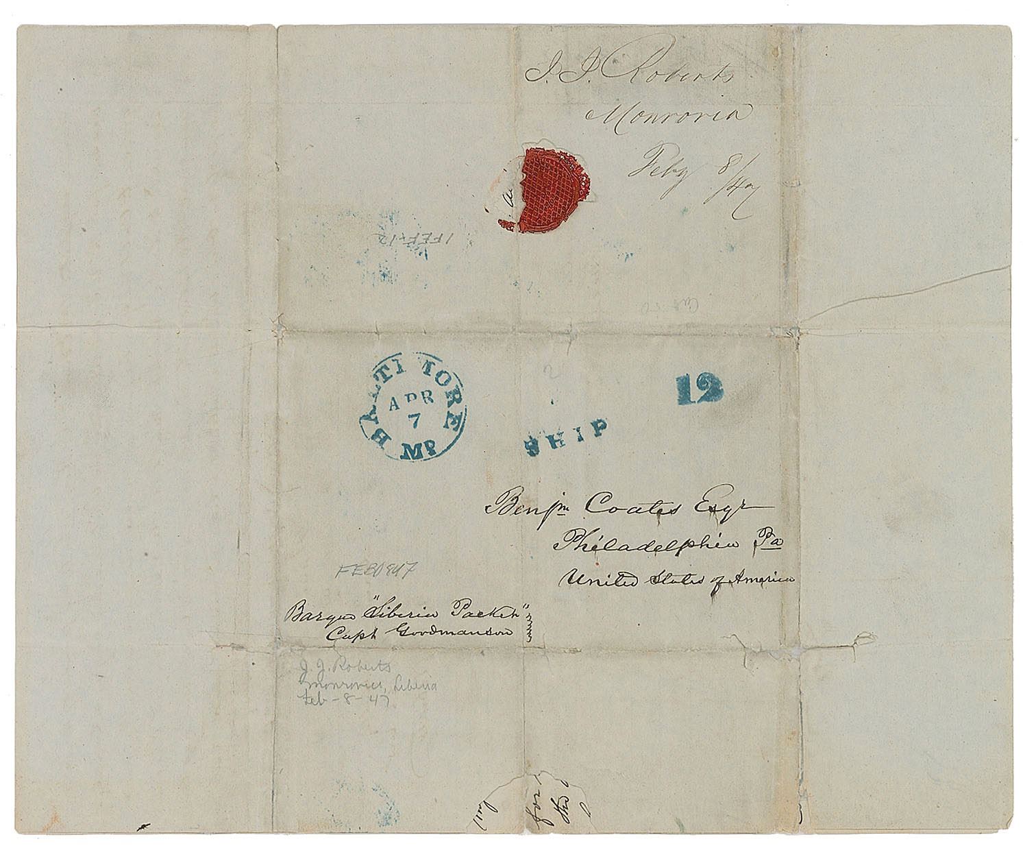 Mixed-race politician born free in Norfolk, Virginia, who emigrated to Liberia in 1829 and became the nation's first president in 1848 (1809–1876). Significant ALS signed “J. J. Roberts,” three pages on two adjoining sheets, 9 x 11.25, February 8, 1847. Letter to Benjamin Coates, written from Monrovia, Liberia. In part: "By the ‘Liberia Packet’ and ‘Margaret Ann’ I had the honor of receiving your favors…with several packages of newspapers…I regret exceedingly, however, that I have no means of reciprocating your kindness in this respect. Should we live fifty years longer, which, in my case, is very doubtful, I should, no doubt, be able to send you, in exchange, papers and pamphlets published in Liberia…I have communicated to Genl Lewis your wishes in regard to cash sales and quick returns. He will avail himself of every opportunity to make remittances.