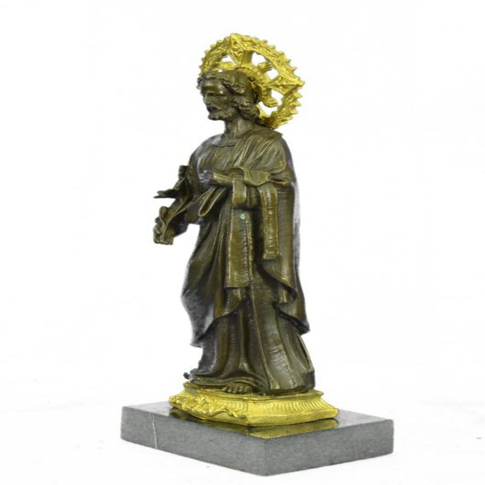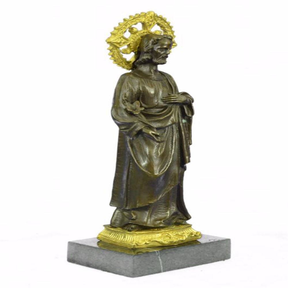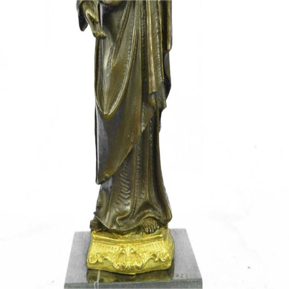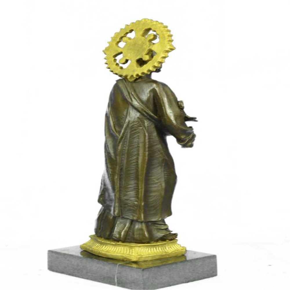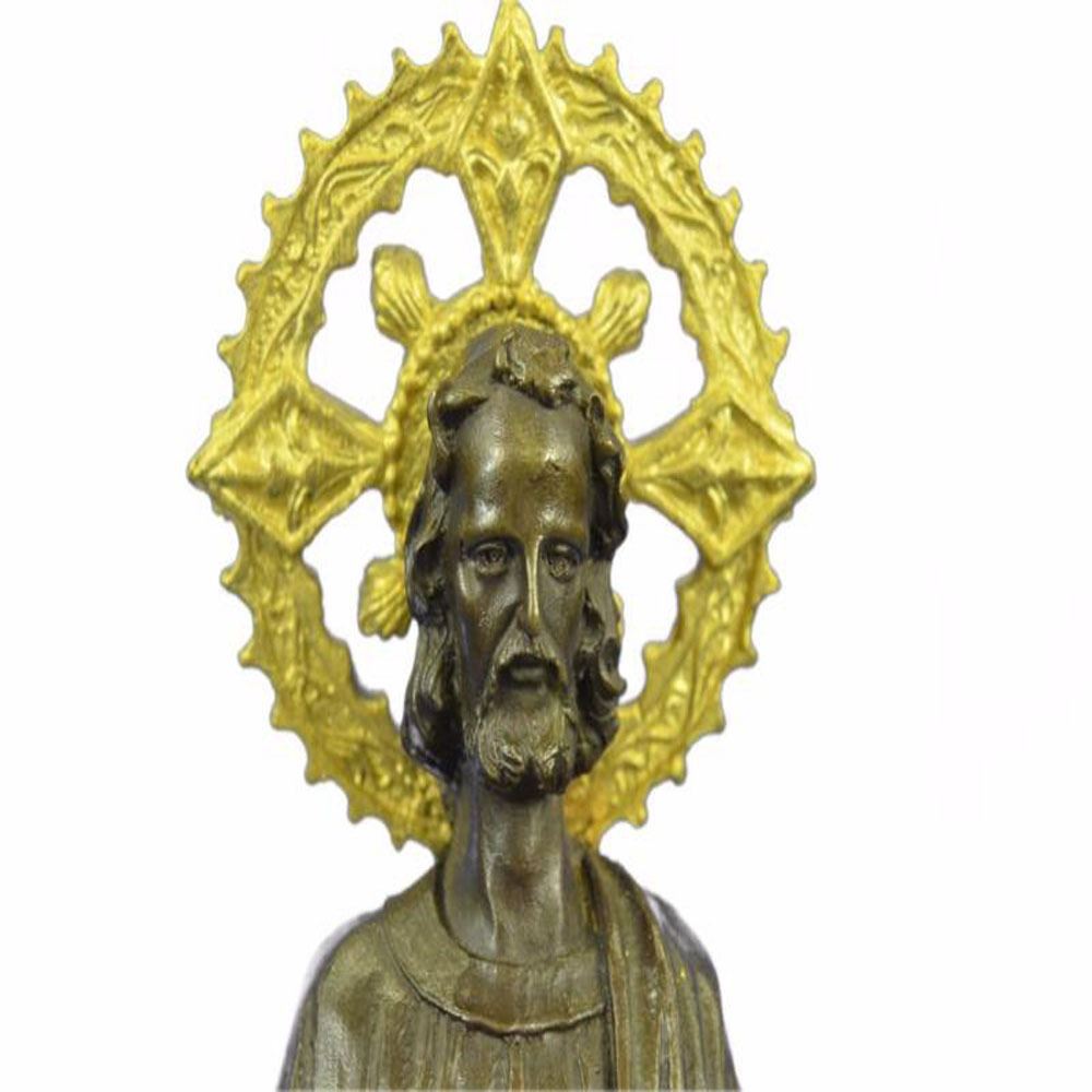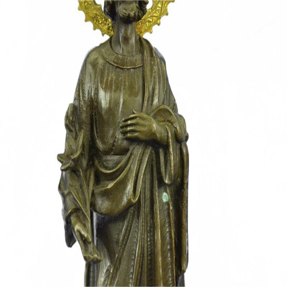 In both Catholic and Protestant traditions, Joseph is regarded as the patron saint of workers and is associated with various feast days. Pope Pius IX declared him to be both the patron and the protector of the Catholic Church, in addition to his patronages of the sick and of a happy death, due to the belief that he died in the presence of Jesus and Mary. In popular piety, Joseph is regarded as a model for fathers and has also become patron of various dioceses and places. The Bronze handmade Sculpture was cast using the ancient method of lost wax casting and stained with a brown and gold patina finish for preservation and it is mounted upon a marble base. Bronze Dimensions with Marble Base: Height 13 X Width 5 inches. Weight: 8 LBS.