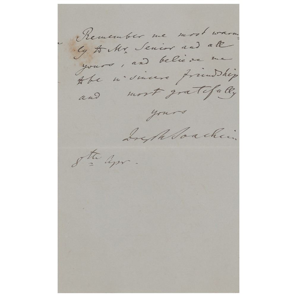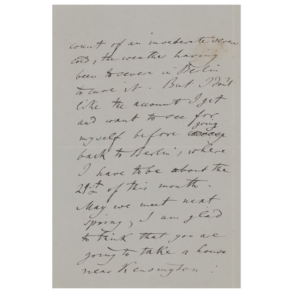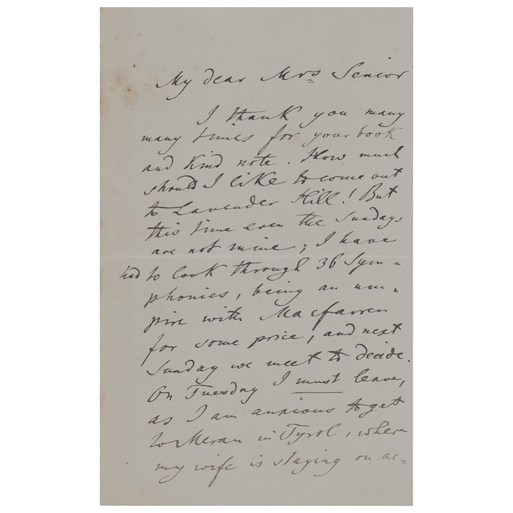 ALS, three pages on two adjoining sheets, 4.5 x 7, April 8. Letter to Mrs. Senior, in part: "How much should I like to come out to Lavender Hill! But this time even the Sundays are not mine; I have had to look through 36 Symphonies, being an umpire‰Û_I am anxious to get to Meran in Tyrol, where my wife is staying on account of an inveterate severe head cold." In very good to fine condition, with some small stains, and old mounting residue on the back of the last page.