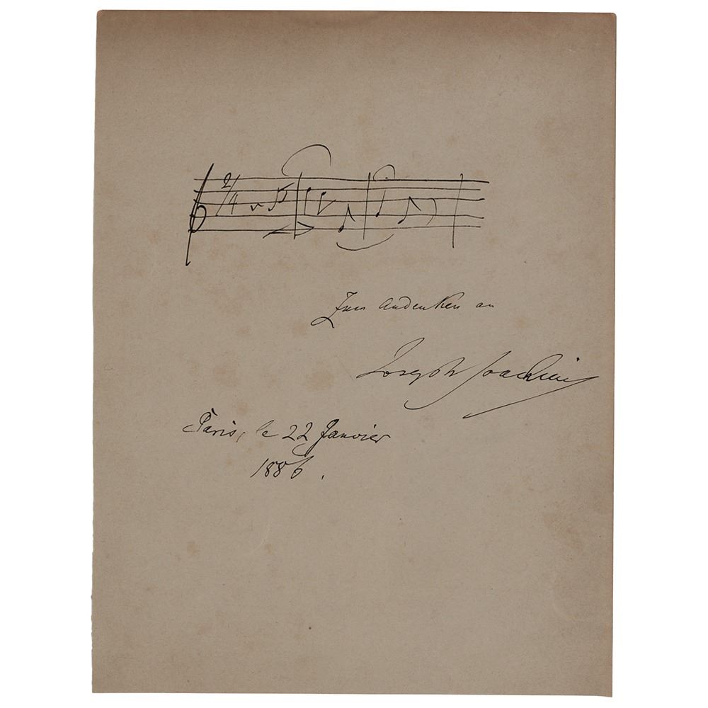Hungarian violinist and composer (1831–1907) ranked second only to Paganini among 19th-century virtuosi. AMQS on an off-white 6.75 x 8.75 sheet, signed below in German in black ink, “Joseph Joachim, Paris, le 22 Janvier 1886,” who adds three crisp bars of music above. In fine condition, with faint stains and light toning. Accompanied by an unsigned postcard photo of Joachim with his violin.