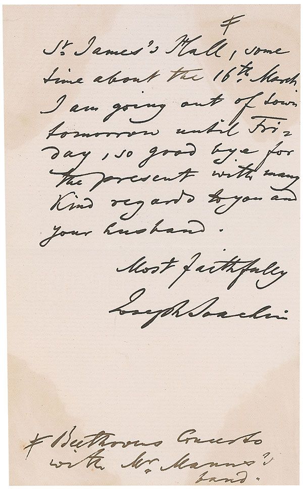 German violinist and composer (1831–1907) ranked second only to Paganini among 19th-century virtuosi. He was a close associate of Johannes Brahms, who wrote a number of works (including the Violin Concerto) specifically with Joachim’s talents in mind. ALS, two pages on two adjoining sheets, 4.5 x 7, no date. Letter to Mrs. Senior. In part: “I must thank you in one line for your cheering note…it is so delightful to know that you are so much better and even allowed to go to the Crystal palace for a rehearsal. But alas, I am not to play there any more; I must come some day and play at your house, and I will let you know when there is the rehearsal for the concert in aid of the blind at St. James Hall.” Reverse of second page is affixed to a slightly larger sheet. Spots of toning to second page from adhesive on reverse, with lighter toning to first page, and some slight brushing to a few letters of text, otherwise fine condition.