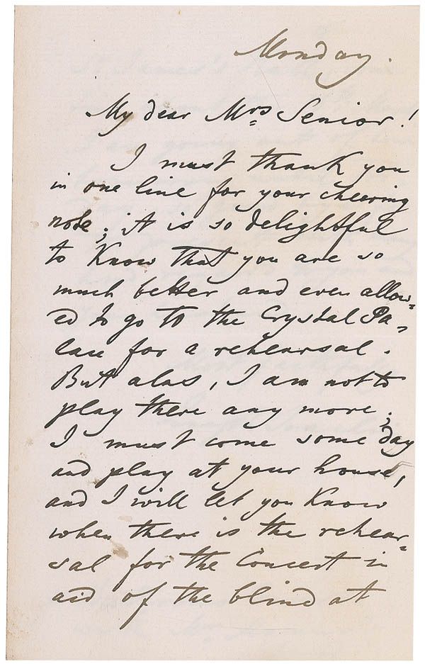 German violinist and composer (1831–1907) ranked second only to Paganini among 19th-century virtuosi. He was a close associate of Johannes Brahms, who wrote a number of works (including the Violin Concerto) specifically with Joachim’s talents in mind. ALS, two pages on two adjoining sheets, 4.5 x 7, no date. Letter to Mrs. Senior. In part: “I must thank you in one line for your cheering note…it is so delightful to know that you are so much better and even allowed to go to the Crystal palace for a rehearsal. But alas, I am not to play there any more; I must come some day and play at your house, and I will let you know when there is the rehearsal for the concert in aid of the blind at St. James Hall.” Reverse of second page is affixed to a slightly larger sheet. Spots of toning to second page from adhesive on reverse, with lighter toning to first page, and some slight brushing to a few letters of text, otherwise fine condition.