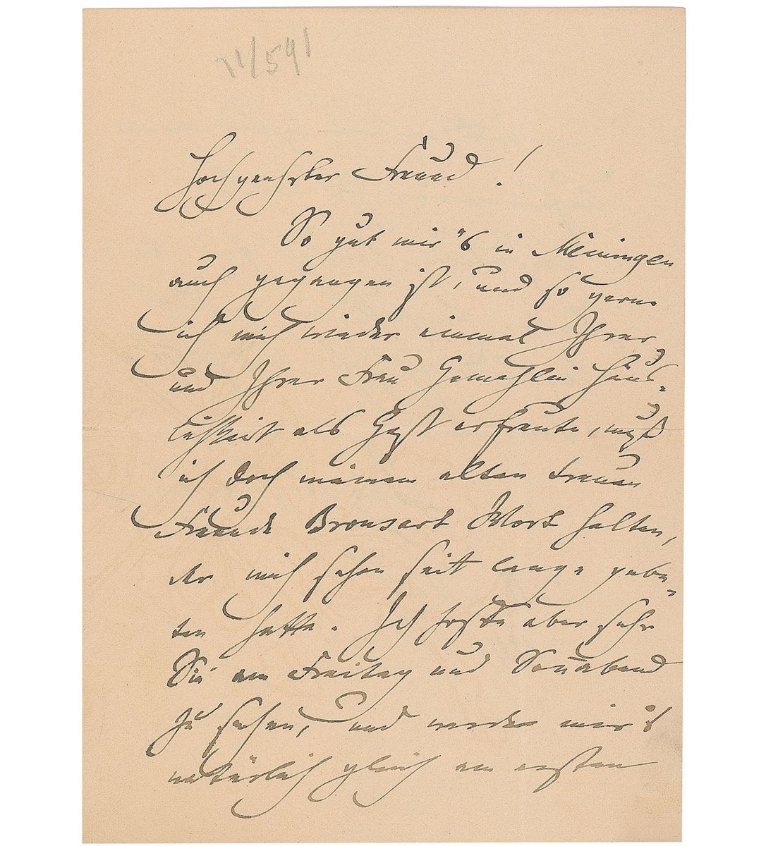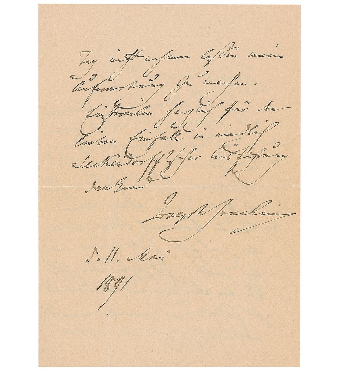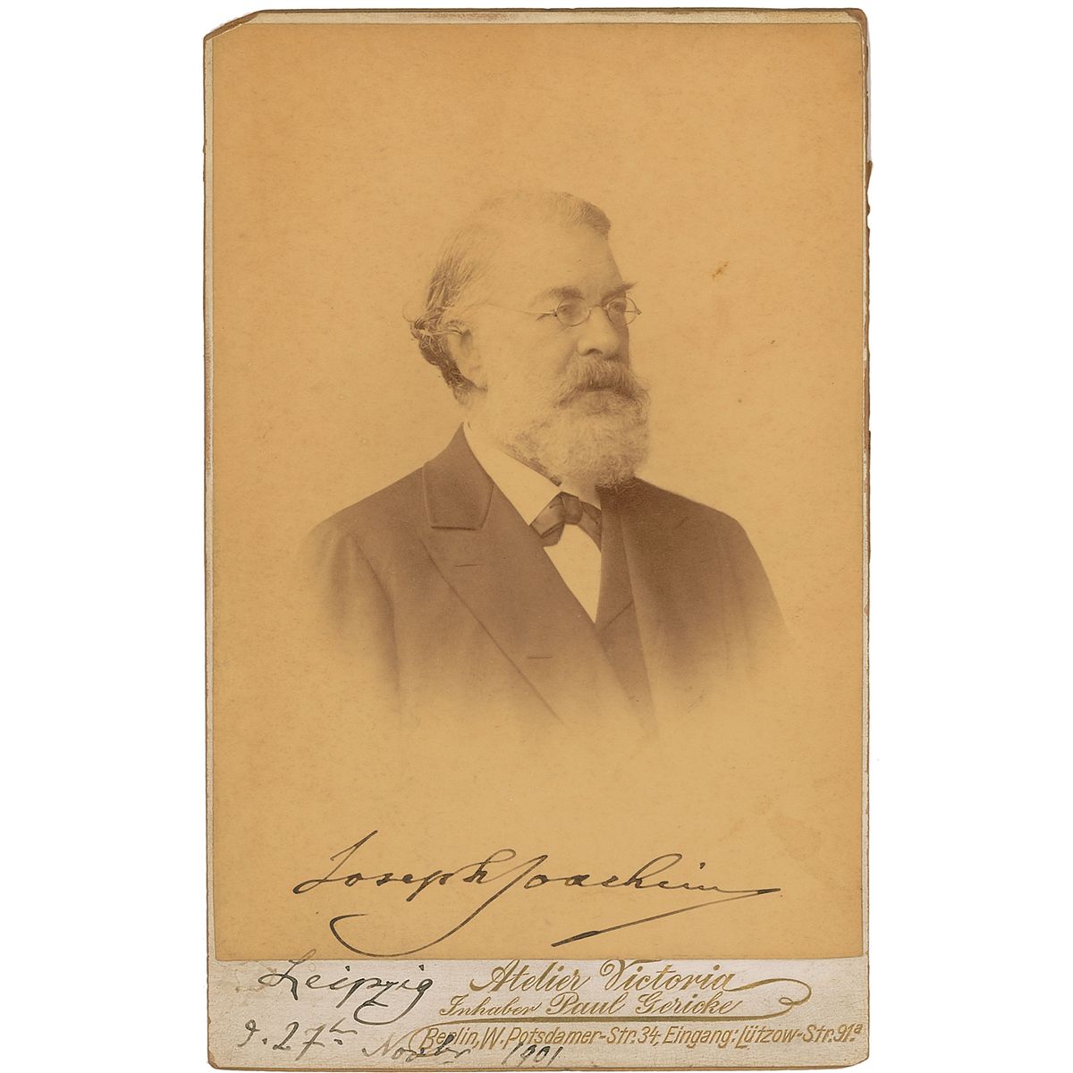 Hungarian violinist and composer (1831–1907) ranked second only to Paganini among 19th-century virtuosi. He was a close associate of Johannes Brahms, who wrote a number of works (including the Violin Concerto) specifically with Joachim’s talents in mind. Two items: a 4 x 6.5 cabinet bust portrait by Atelier Victoria of Berlin, signed at the bottom in black ink, “Joseph Joachim, Leipzig, 27 November 1901”; and an untranslated ALS in German, one page both sides, 5 x 7, May 11, 1891. In overall fine condition, with trimmed edges to the cabinet photo. Originates from the collection of American violinist and pianist Louis Persinger (1887–1966), who trained at the Leipzig Conservatory and later taught at Juilliard, mentoring the likes of Yehudi Menuhin, Ruggiero Ricci, and Isaac Stern.