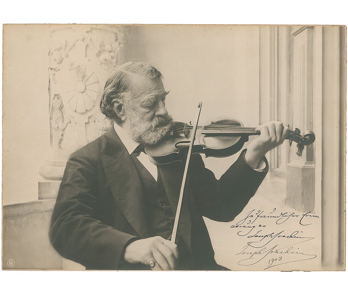Magnificent matte-finish 15 x 10.75 mounted photo of Joachim playing his violin, boldly signed and inscribed in black ink in German. The image also bears a facsimile signature inherent to the photograph. In fine condition. Originates from the collection of American violinist and pianist Louis Persinger (1887–1966), who trained at the Leipzig Conservatory and later taught at Juilliard, mentoring the likes of Yehudi Menuhin, Ruggiero Ricci, and Isaac Stern.