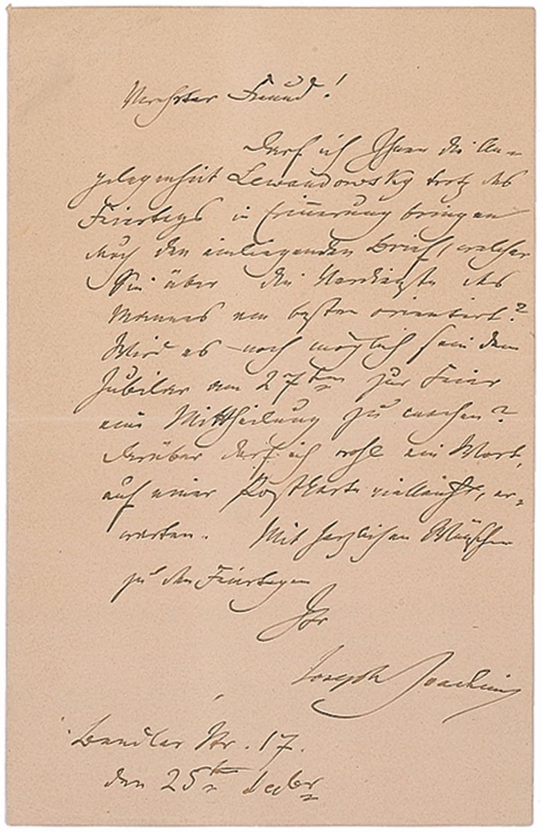 Hungarian violinist and composer (1831–1907) ranked second only to Paganini among 19th-century virtuosi. ALS in German, one page, 5.5 x 8.75, December 25, no year. Letter to a friend, in full (translated): “May I take this opportunity, despite the holiday, to refresh your memory about Lewandowsky whose merits are best expressed in the enclosed letter. Will it be possible still to send a message to the celebrant in time for the ceremony on the 27th? May I expect a word about this—perhaps on a postcard?” In fine condition, with light horizontal bends and some trivial creasing and erased pencil notations to left corners. Accompanied by an unsigned modern photo.