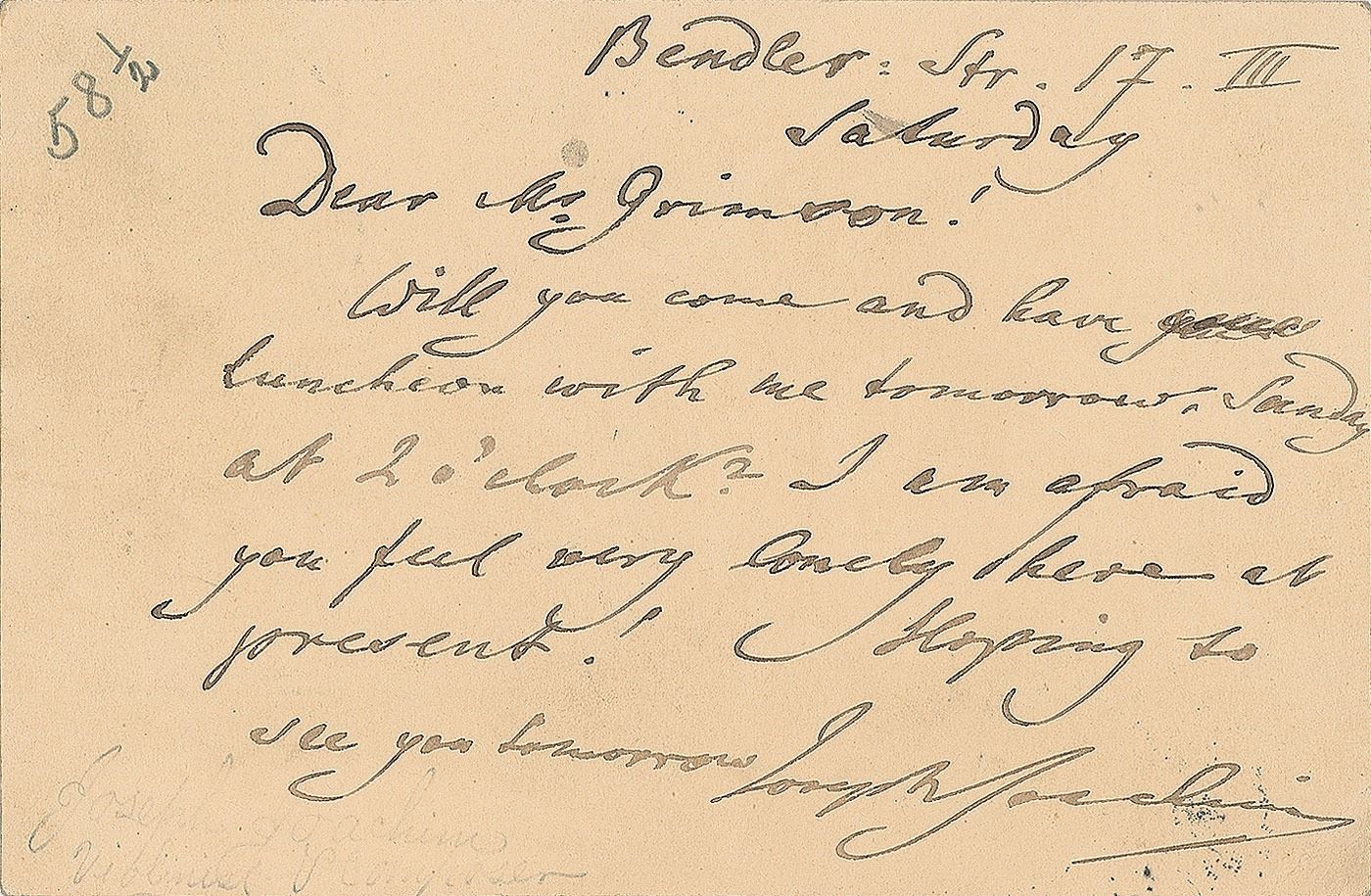 Hungarian violinist and composer (1831–1907) ranked second only to Paganini among 19th-century virtuosi. ALS, one page, 5.5 x 3.5, March 17. Letter to Mr. Grimson, in part: "Will you come and have luncheon with me tomorrow, Sunday at 2 o'clock. I am afraid you feel very lonely here at present!" In fine condition.