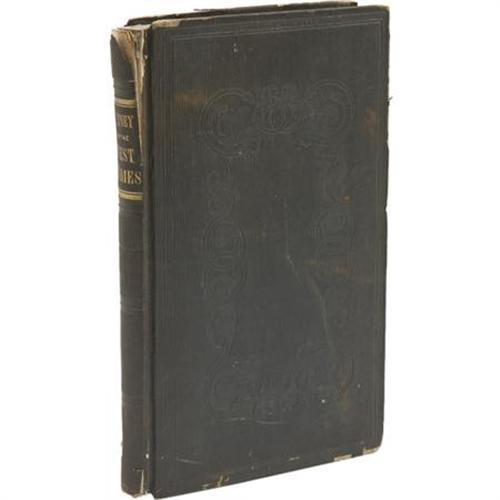 <B>Joseph John Gurney. </B></I><B><I>Familiar Letters to Henry Clay of Kentucky, Describing a Winter in the West Indies</B></I></B></I>. New York: Mahlon Day & Co., 1840.<BR> <BR>First edition. Octavo. 203 pages. <BR><BR>Original boards with floral decoration in blind. Titles stamped in gilt on the spine. Moderate shelf wear to the edges of the boards with a small area of loss at the head and foot of the spine. Front joint with a 3.5" crack. Contents toned with some foxing mainly on the preliminary pages. One third of the second front free endpaper cleanly removed. Very good.<BR><BR><BR><b>Shipping:</b> Books & Catalogs (<a target="_blank" href="http://www.heritageauctions.com/common/shipping.php">view shipping information</a>)
