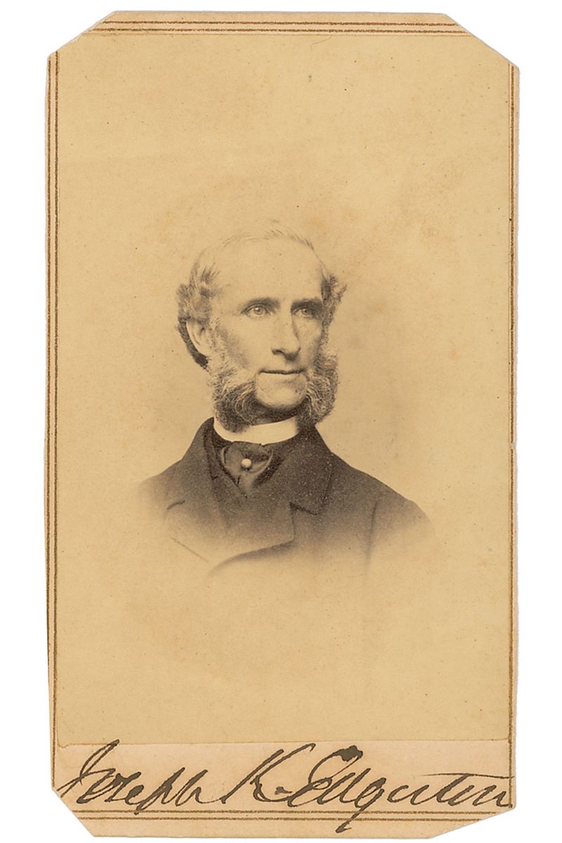 Democratic politician (1818–1893) who served as senator from Indiana. Original 2.25 x 4 carte-de-visite portrait of Edgerton, signed in the lower border in black ink, “Joseph K. Edgerton.” Published by the Whitehurst Gallery of Washington. In fine condition, with clipped corners affecting the extreme edges of the signature.