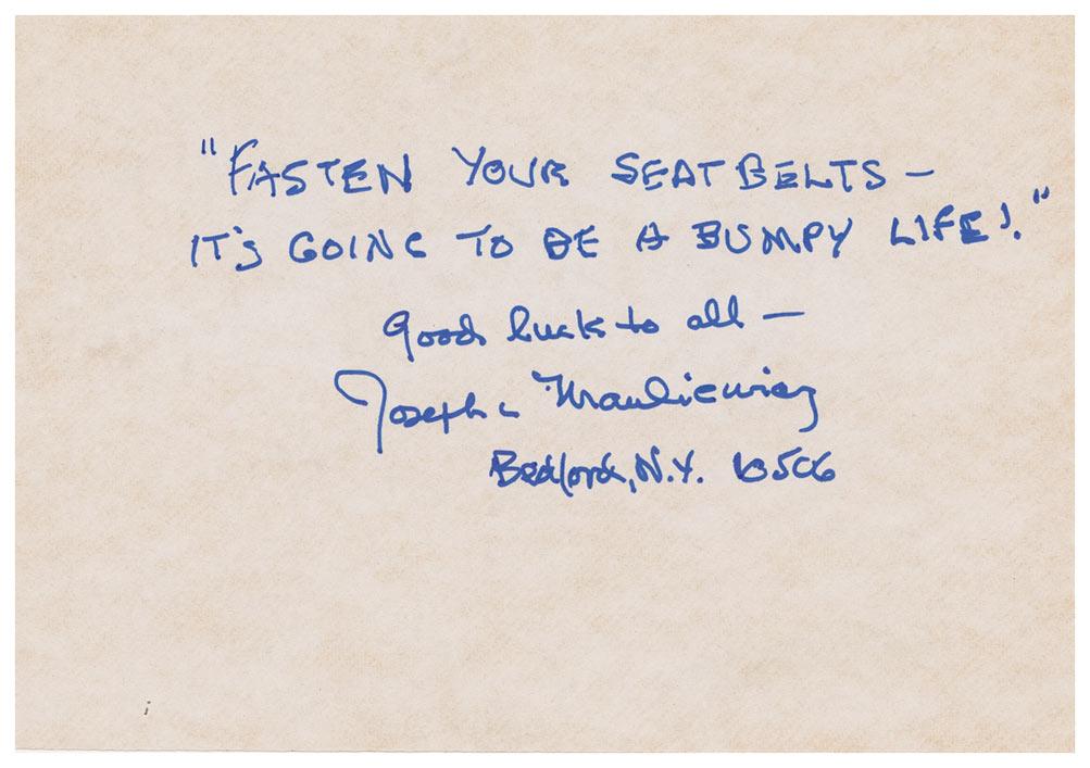 Film director, screenwriter, and producer (1909–1993) best known as the writer-director of the Oscar-winning All About Eve. AQS, signed “Good luck to all—Joseph L. Mankiewicz, Bedford, N.Y. 10506,” on an 8 x 5.5 card. Mankiewicz paraphrases Bette Davis’ famed quotation from All About Eve. In full: “’Fasten your seatbelts—it’s going to be a bumpy life!’” In fine condition. According to the consignor, he obtained the quotation from Mankiewicz through the mail in the 1980s, sending his request on school letterhead. The filmmaker called the school to make sure that the request was legitimate.