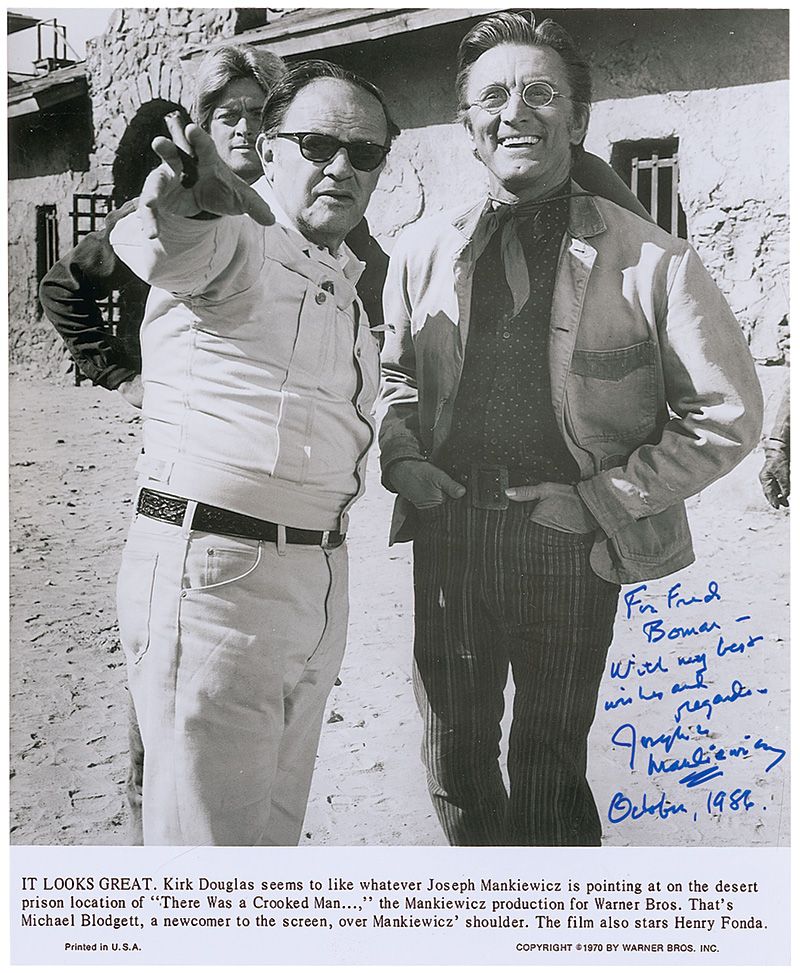 Glossy 7.5 x 9 Warner Brothers publicity photo of Mankiewicz and Kirk Douglas on the set of There Was a Crooked Man, signed and inscribed in blue felt tip “For Fred Bomar—with my best wishes and regards, Joseph L. Mankiewicz, October, 1986.” In fine condition, with lightly trimmed edges.