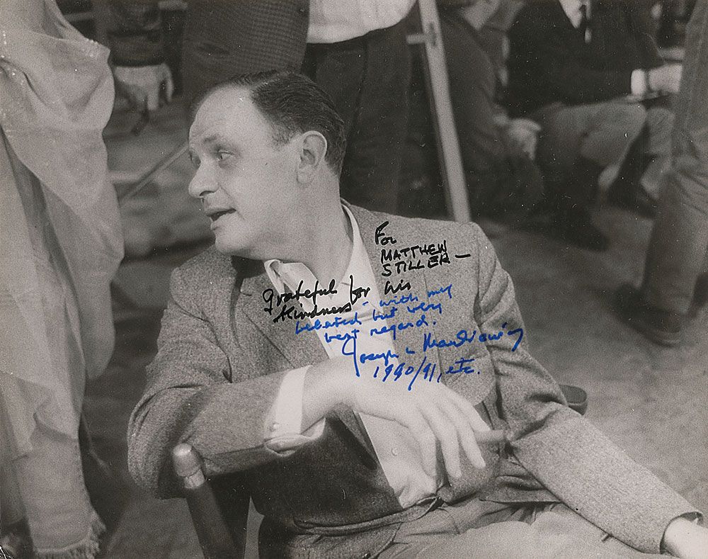 Glossy 10 x 8 photo of Mankiewicz looking over his shoulder while seated on a movie set, signed and inscribed in blue and black felt tip, “For Matthew Stiller—grateful for his kindness—with my belated but very best regard, Joseph L. Mankiewicz 1990/91 etc.” In fine condition.