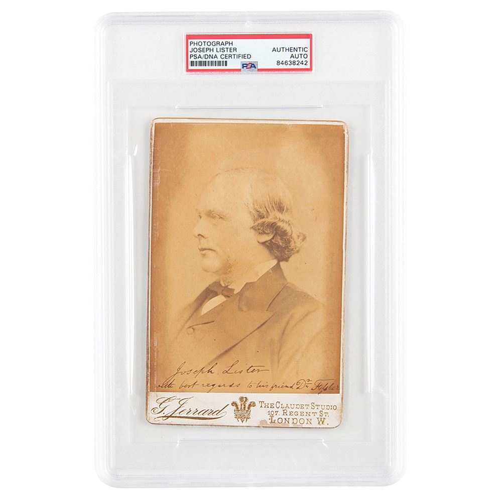 Very rare 4.25 x 6.5 cabinet bust portrait of Lister by G. Jerrard of London, signed and inscribed at the bottom of the image in black ink, "Joseph Lister, with best regards to his friend Dr. Fessler." In very good condition, with moderate overall toning to the image and some newspaper clippings affixed to reverse. Exceptionally rare in this format, this is the only example of a Lister signed photo that we have ever offered. Encapsulated in a PSA/DNA authentication holder.