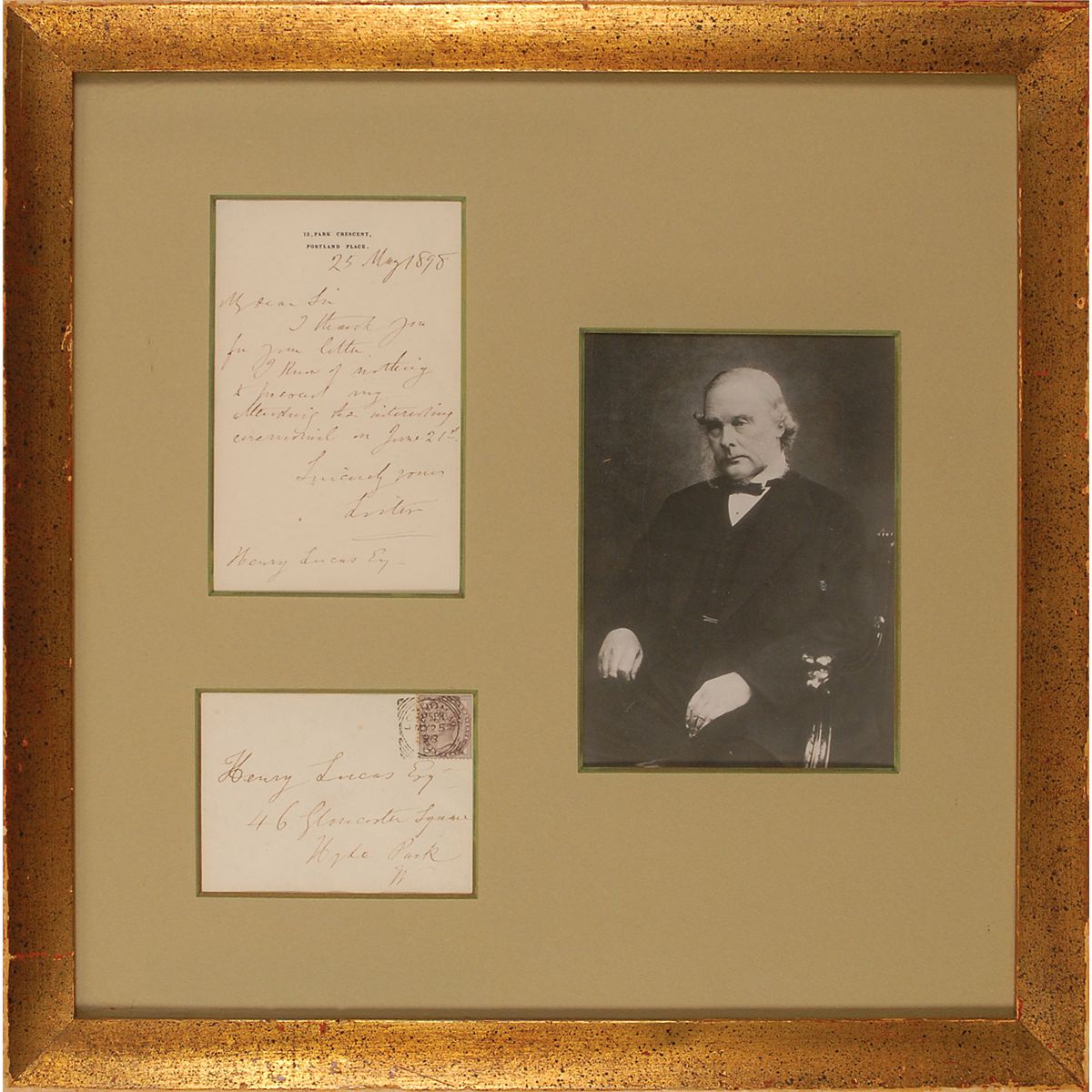British surgeon (1827–1912) who pioneered the practice of sterile surgery, one of the most important medical advances of the day. ALS signed “Lister,” one page, 3.25 x 5.5, personal letterhead, May 25, 1898. Letter to Henry Lucas. In full: “I thank you for your letter. I know of nothing to prevent my attending the interesting ceremonial on June 21st.” Matted and framed with a seated portrait of Lister and the original mailing envelope panel, addressed in Lister’s hand, to an overall size of 15 x 15.25. In fine condition.