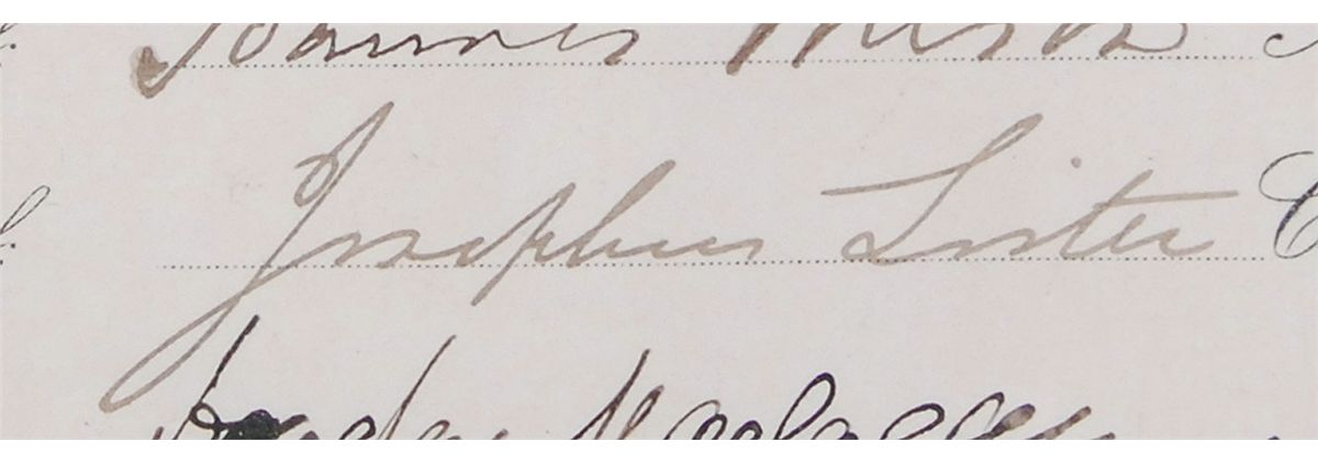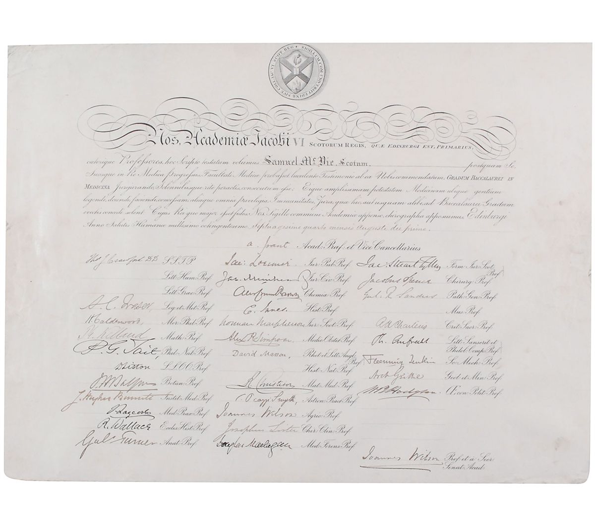 British surgeon (1827–1912) who innovated the practice of sterile surgery, one of the most important medical advances of the day. Partly-printed DS in Latin, signed “Josephus Lister,” one page, 19.5 x 15, August 1, 1874. A diploma awarding a bachelor of medicine degree from the University of Edinburgh to Samuel McVie, signed below by 32 professors of the university. In addition to Lister, other signers include Robert Christison, toxicologist; Charles Piazzi Smyth, astronomer; William R. Sanders, pathologist; Philip Kelland, mathematician; John Hughes Bennett, physician; William B. Hodgson, educational reformer; James Lorimer, jurist and political philosopher; and John H. Balfour, botanist. Creasing to borders and a small tear to right edge, otherwise fine condition. In 1869, after revolutionizing surgical procedure with his work on antisepsis, Lister was named professor of Clinical Surgery at Edinburgh; he enjoyed his popularity there—with his clinics and classes packed with eager students—until 1877, when he moved to King’s College in London. A handsomely engraved document featuring the rare Latin form of Lister’s signature.