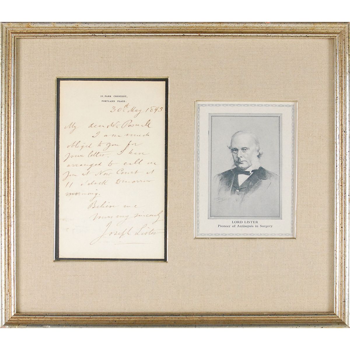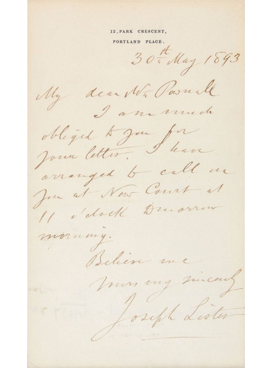 British surgeon (1827–1912) who innovated the practice of sterile surgery, one of the most important medical advances of the day. ALS, one page, 3.75 x 6.25, black-bordered personal letterhead, May 30, 1893. Letter to Mr. Pownall. In full: “I am much obliged to you for your letter. I have arranged to call on you at New Court at 11 o’clock tomorrow.” Attractively cloth-matted and framed with an engraved portrait to an overall size of 12 x 10.5. In fine condition. This letter is black-bordered in memory of Lister’s wife, Agnes Syme Lister, who had passed away on April 12, 1893.