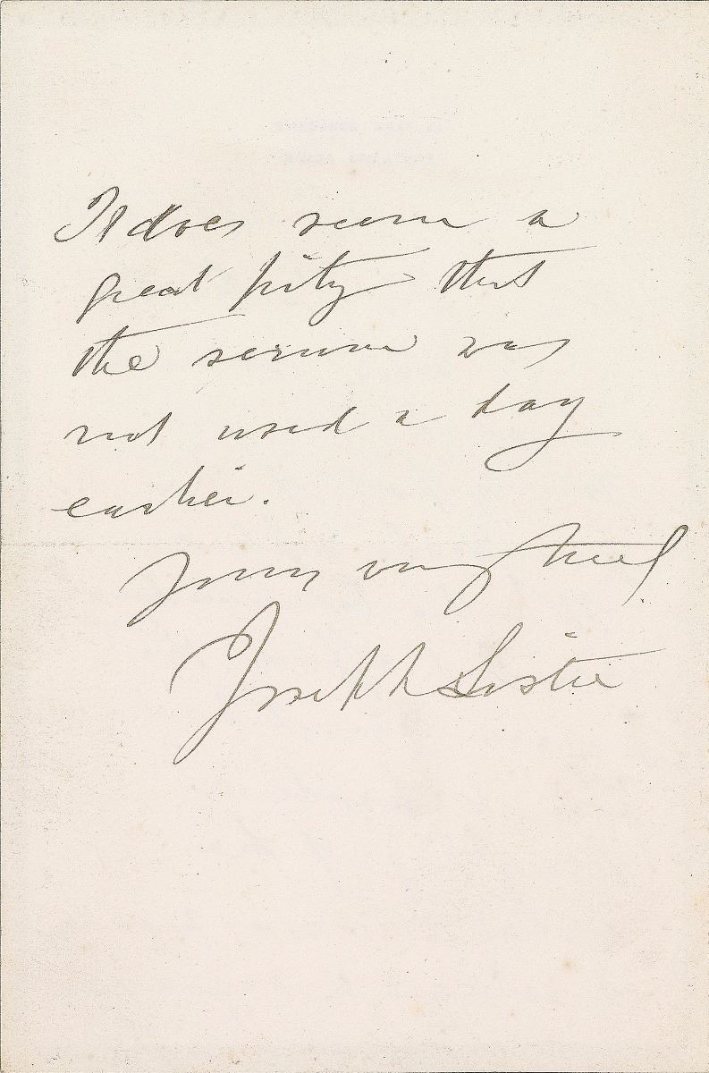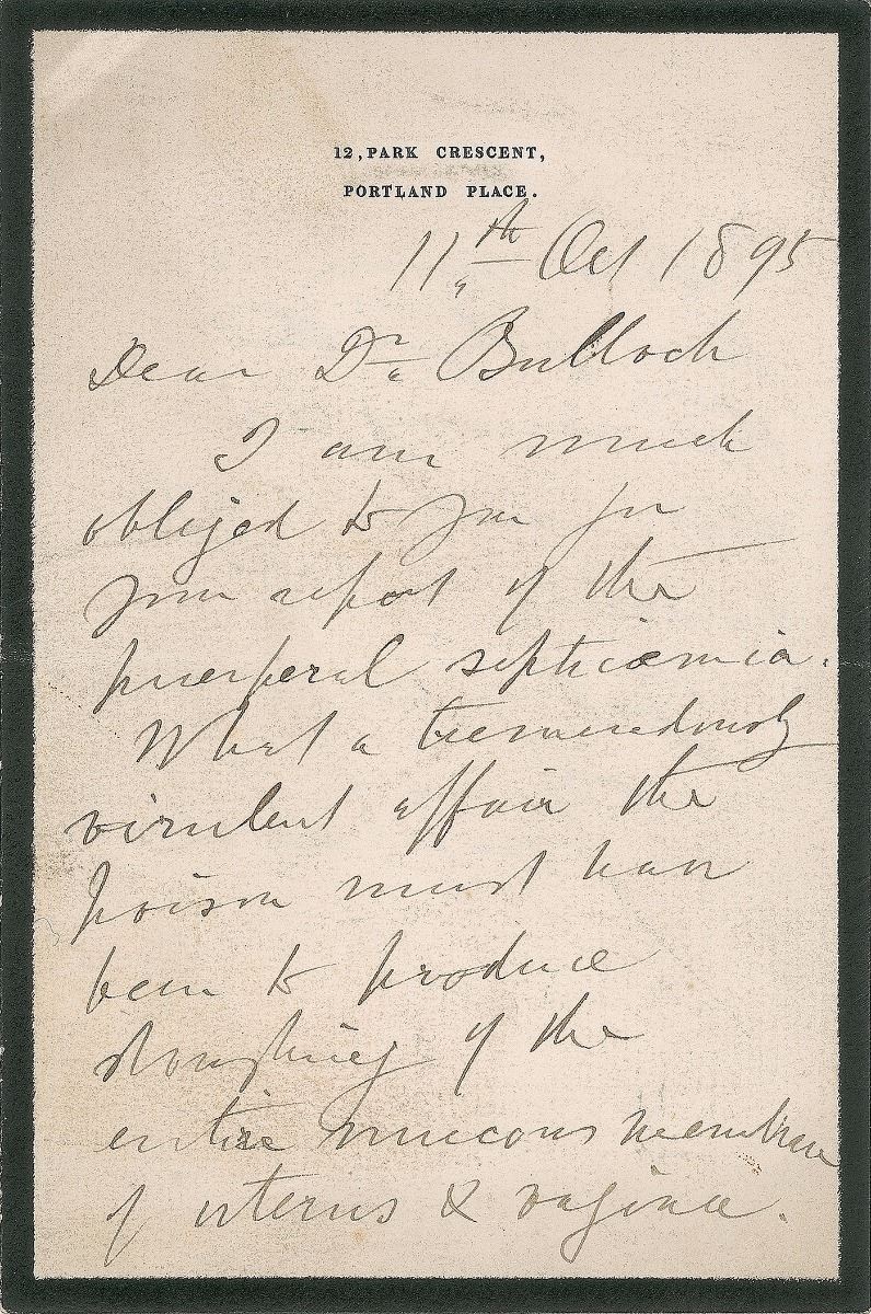 ALS, one page both sides, 4 x 6, black-bordered 12 Park Crescent letterhead, October 11, 1895. Letter to Dr. William Bulloch, in full: “I am much obliged to you for your report of the puerperal septicemia. What a tremendously virulent affair the poison must have been to produce sloughing of the entire mucous membrane of uterus & vagina. It does seem a great pity that the serum was not used a day earlier.” In fine condition, with soiling to first page. Accompanied by the original mailing envelope, addressed in Lister’s own hand.