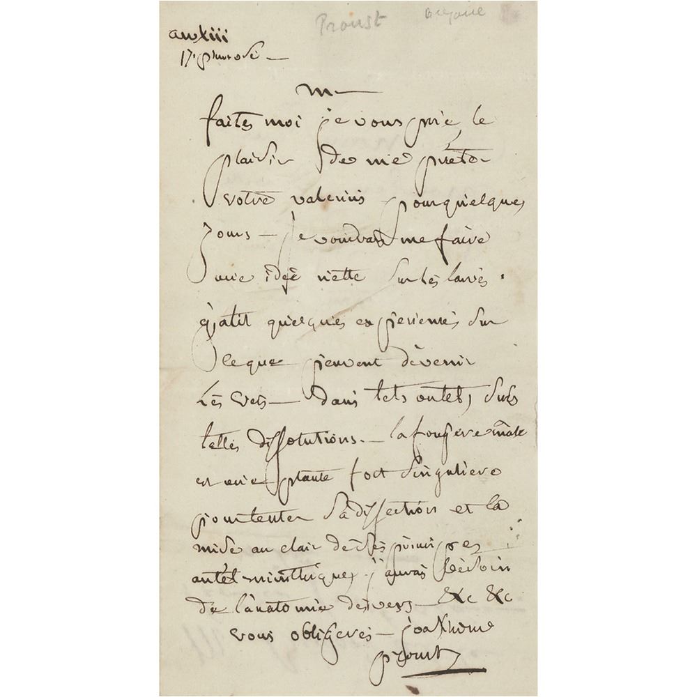 ALS in French, signed “Proust,” one page, 3.75 x 7, no date. Untranslated letter to a professor of botany. In fine condition, with light creasing.