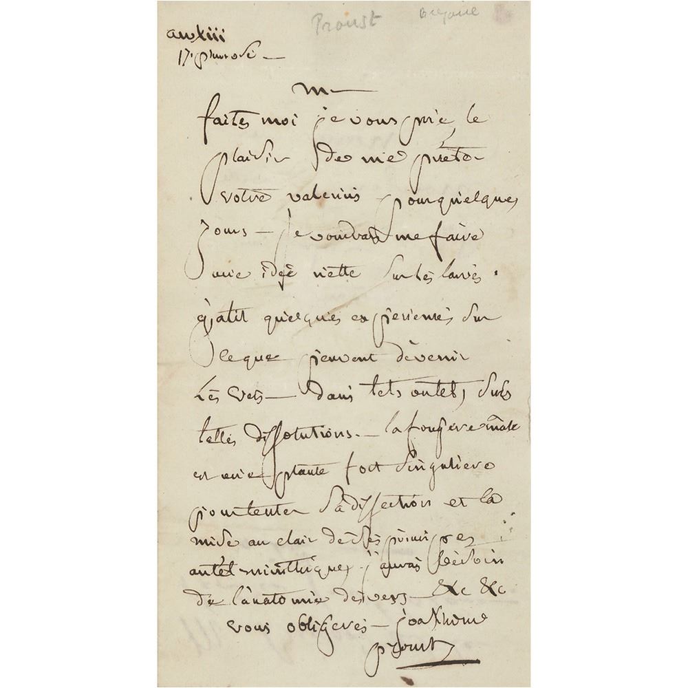 ALS in French, signed “Proust,” one page, 3.75 x 7, no date. Untranslated letter to a professor of botany. In fine condition, with light creasing.