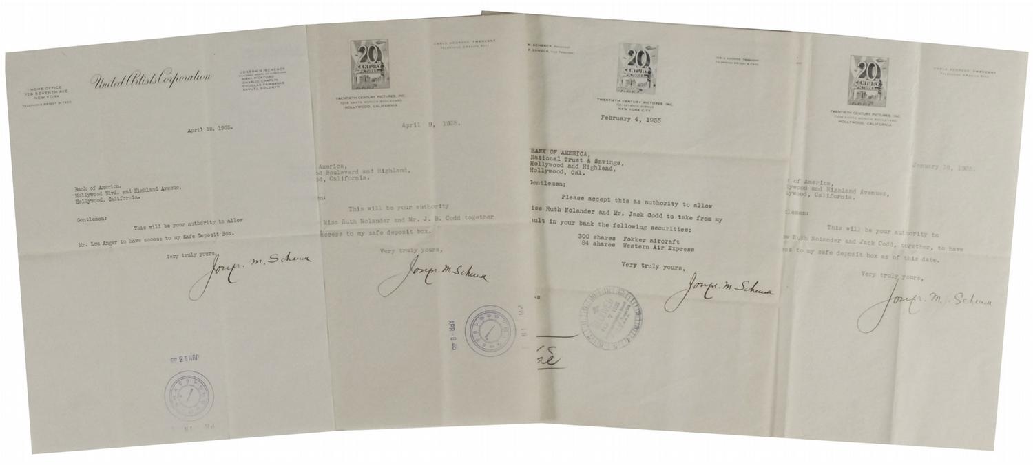 Pioneer executive (1878–1961) who played a key role in the development of the United States film industry. Four TLSs, all one page, 8.5 x 11, three on 20th Century Pictures letterhead and one on United Artists Corporation letterhead, dated 1935. Each grants a specific individual access to the motion picture executive’s safety deposit box at the Bank of America. In overall very good to fine condition with intersecting horizontal and vertical folds crossing his name, light wrinkling, toning, and bank stampings on three letters. Accompanied by one Bank of America envelope with Schenck’s typed name.